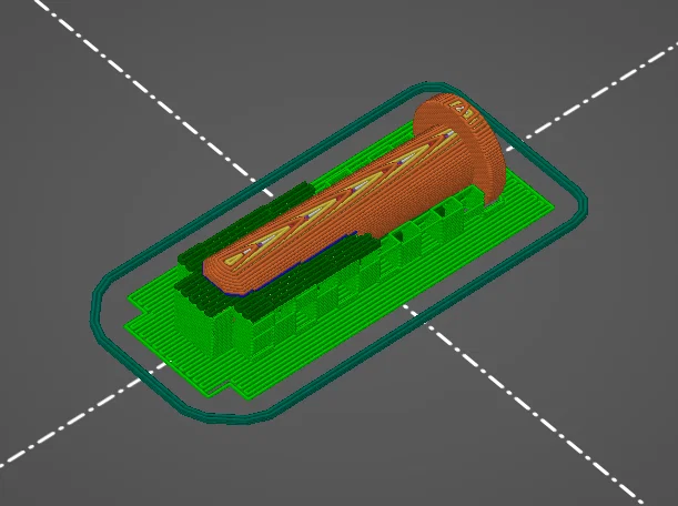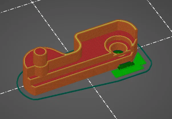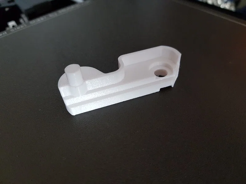 In bằng nhựa PETG Prusament Signal White. Trục bản lề được in nằm ngang để tăng độ chắc chắn. Chiều cao lớp in 0.2mm và 2 perimeters (vách). Cần dùng hỗ trợ (supports) cho cả 2 mảnh.