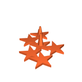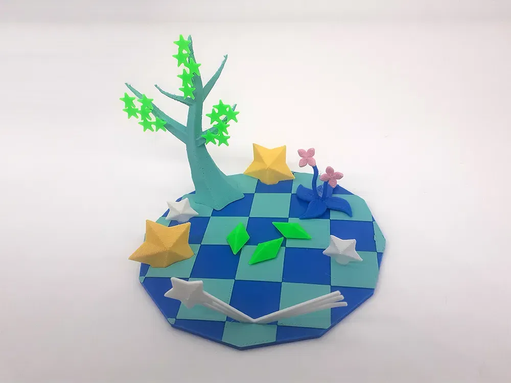 Một mảnh trưng bày hình tròn thu nhỏ với một cây sao, các mảnh sao, các ngôi sao rơi và một bông hoa.