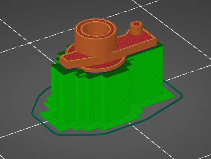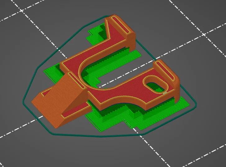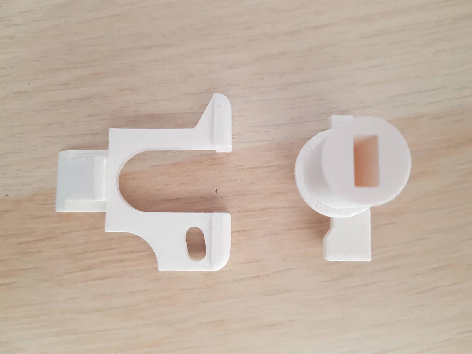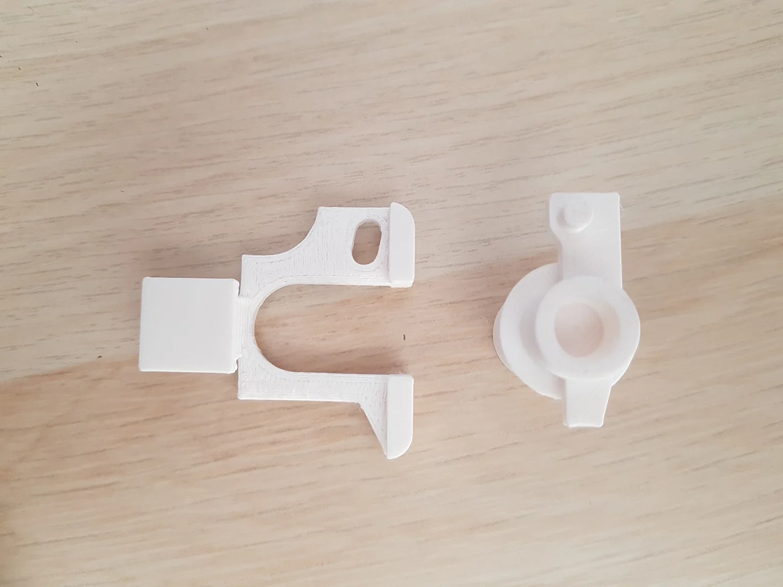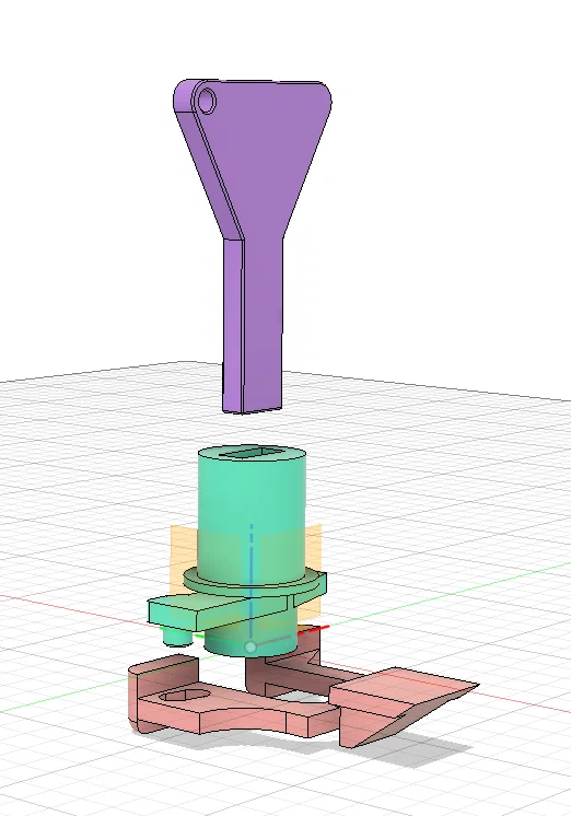 In bằng nhựa PETG Prusament màu Signal White. Trục đặt thẳng đứng còn chốt đặt nằm ngang với phần "trượt" hướng lên trên. Chiều cao lớp in 0.2mm và 3 perimeter. Cần sử dụng hỗ trợ (support) cho cả hai bộ phận.