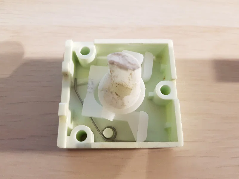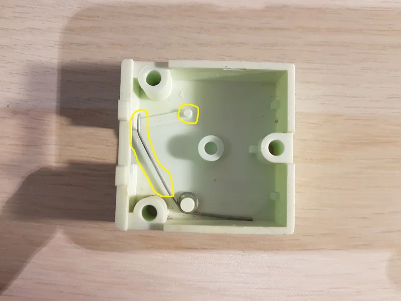 Có một cái lò xo hồi vị giúp giữ chốt ở vị trí đóng. Mình tận dụng lại lò xo cũ. Nếu cần, bạn có thể tự uốn lại từ kẹp giấy hoặc tốt nhất là dùng dây thép lò xo (piano wire).