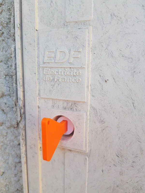Dự án thiết kế và in 3D thay thế ổ khóa cửa tủ điện EDF (Điện lực Pháp) đã bị hỏng. Bao gồm hướng dẫn chi tiết về cách in chốt, trục xoay và chìa khóa bằng nhựa PETG hoặc PLA để bạn có thể tự sửa chữa tủ điện của mình.