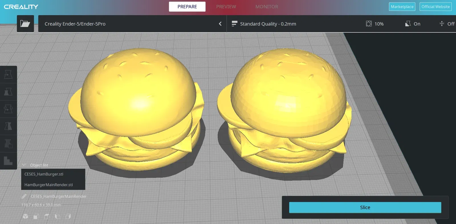 Một tệp STL cũng đã được cung cấp cho 1 chiếc bánh hamburger duy nhất với tất cả các món trong đó.