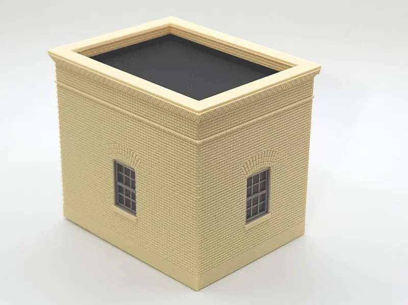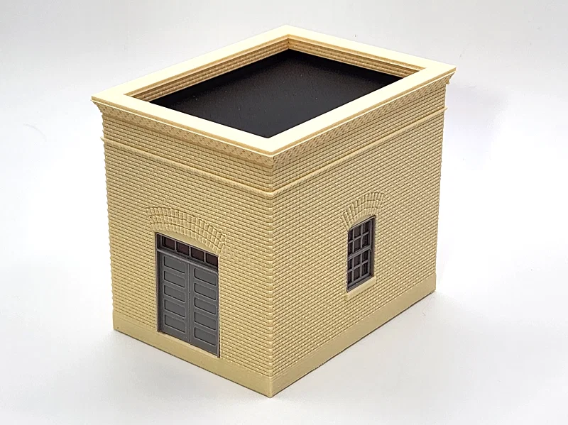 Đây là mô hình một tòa nhà gạch nhỏ mà hồi đó tôi hay lái xe ngang qua. Bạn có thể xem hình ảnh thực tế của nó trên Google Maps tại đây - https://maps.app.goo.gl/a4nyuadv9ih9TkUM9. Dựa trên tỷ lệ và các dấu vết thiết bị còn sót lại trên tường, tôi đoán tòa nhà này trước đây được dùng cho ngành điện lực hoặc viễn thông. Mô hình này được thiết kế chi tiết cả phần nội thất bên trong tường và mái. Các bức tường được in thành một khối duy nhất để tránh các khớp nối ở góc. Phần mái gồm ba phần: khung đỡ, một tấm đại diện cho lớp ván lót bên trong, và phần đỉnh mái cung cấp bề mặt và đường viền chống thấm. Bề mặt mái chưa được tạo vân; bạn có thể hoàn thiện phần mái theo cách mình thích để mô phỏng lớp màng nhựa đường hoặc sỏi. Đối với cửa sổ và cửa ra vào, hãy in hai phần cho mỗi lỗ mở. Bạn kẹp các phần này lại với nhau, đặt lớp kính ở giữa để tạo ra những bộ cửa có chi tiết nội thất. Có thể bạn sẽ cần chà nhám cửa sổ và cửa ra vào một chút cho vừa vặn. Không có vị trí cố định chính xác cho cửa, nên tôi thường chỉ đặt vào giữa lỗ mở sao cho nhìn cân đối là được.