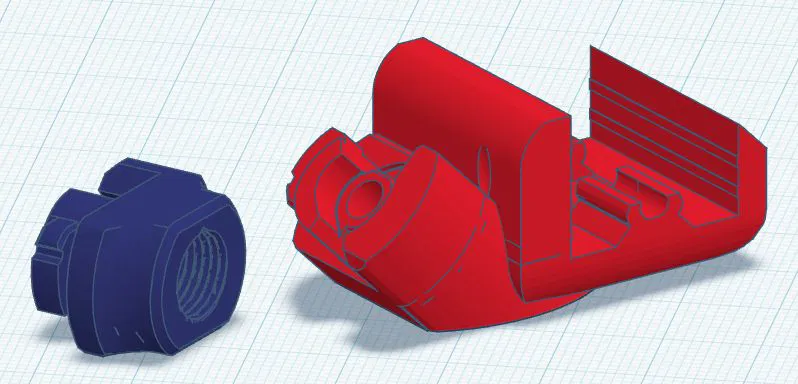Mình lấy cảm hứng từ phần ngàm gắn cảm biến sợi nhựa để tạo ra một cái kẹp rộng hơn, tích hợp kết nối UBBI ở góc nghiêng 45 độ. Mình cũng thiết kế thêm một lỗ nhỏ để bạn cài đầu sợi nhựa khi không dùng tới (giống như kẹp giữ sợi nhựa vậy).