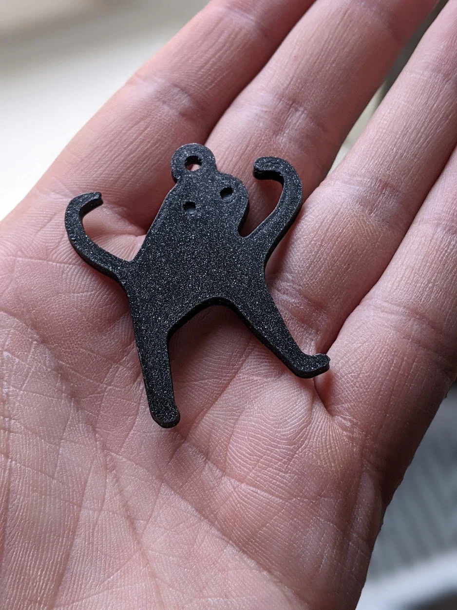 Mình thiết kế bé mèo này để làm phụ kiện trang trí cho súng airsoft. Kích thước em nó khoảng 39×46×3 mm, có sẵn một cái lỗ 3 mm. Để có kết quả in đẹp nhất, bạn nên đặt mặt úp xuống bàn in PEI có vân nhé. :)