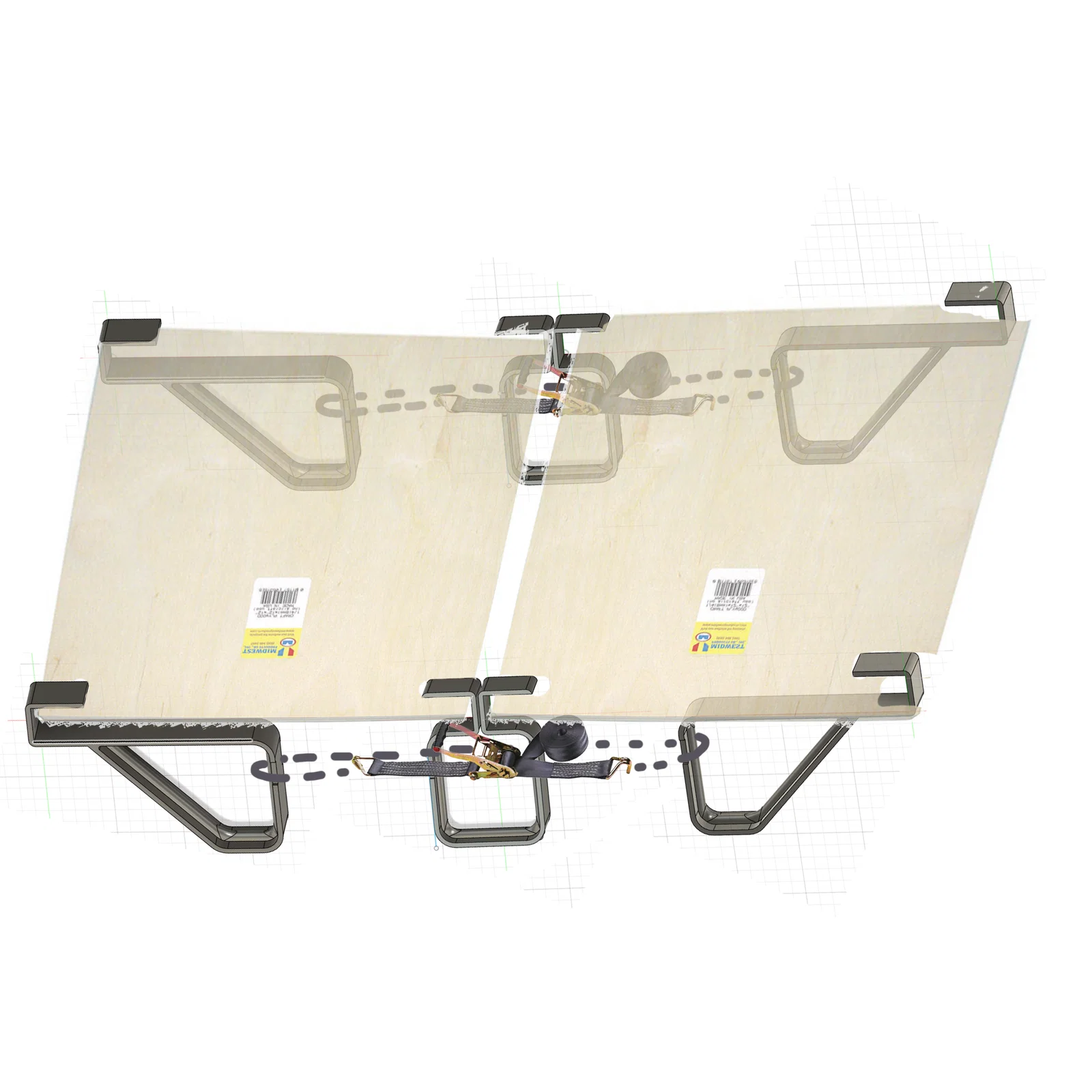Phần khe cắm cho các thanh gỗ được thiết kế vừa vặn với kích thước 1.5 inch. Các rãnh để luồn dây đai (ratchet straps) có chiều rộng là 1 inch.