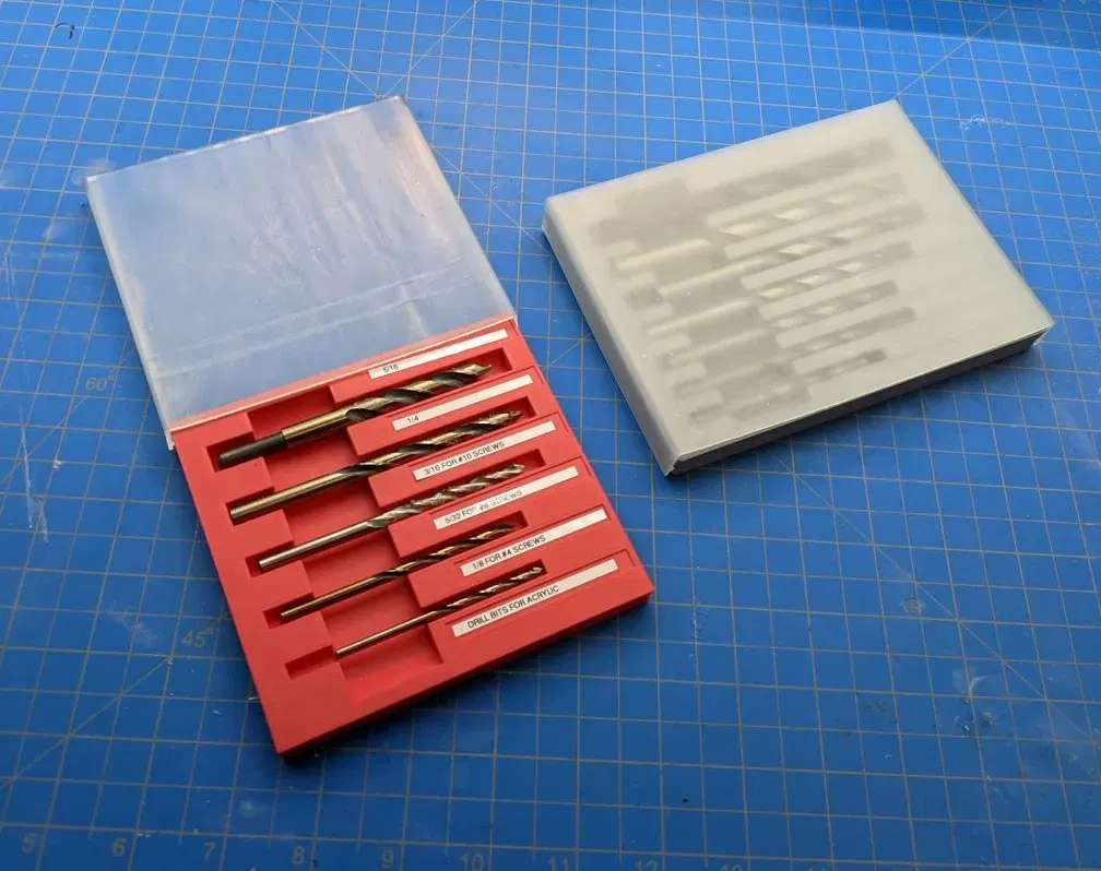 Bộ tổ chức mũi khoan với nắp được thiết kế cho các kích thước khác nhau của mũi khoan bằng acrylic. Để đạt được kết quả tốt nhất, hãy in phần đáy bằng PLA và nắp bằng nhựa trong suốt.