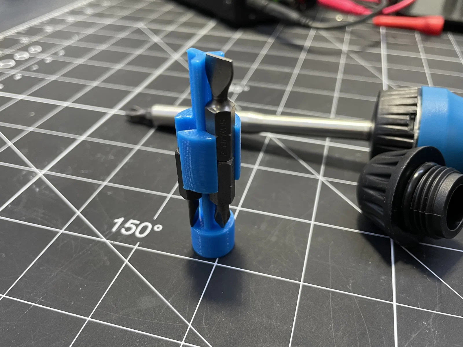 Một mẫu in đơn giản giúp giữ gọn gàng đến sáu đầu vít cho cây tua vít Williams WRS-1 Magnetic Ratcheting Screwdriver. Mẫu này in rất đẹp dù bạn đặt đứng hay đặt nằm với chế độ hỗ trợ (support) kiểu organic (tree). Sau khi in xong, bạn chỉ cần gỡ bỏ phần support và ấn khít vào nắp đậy. Nếu nắp không vặn chặt được ngay lần đầu, hãy ấn miếng in vào sâu hơn một chút nhé.