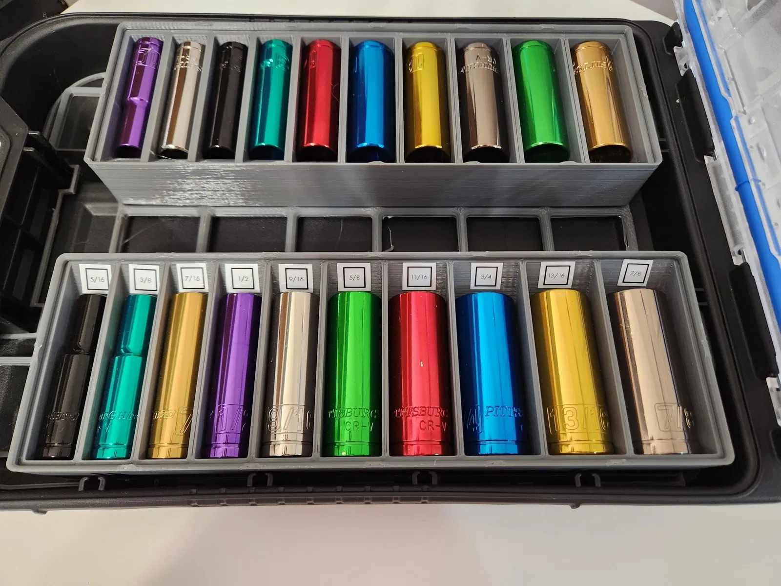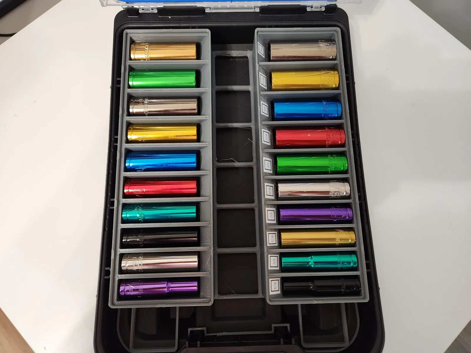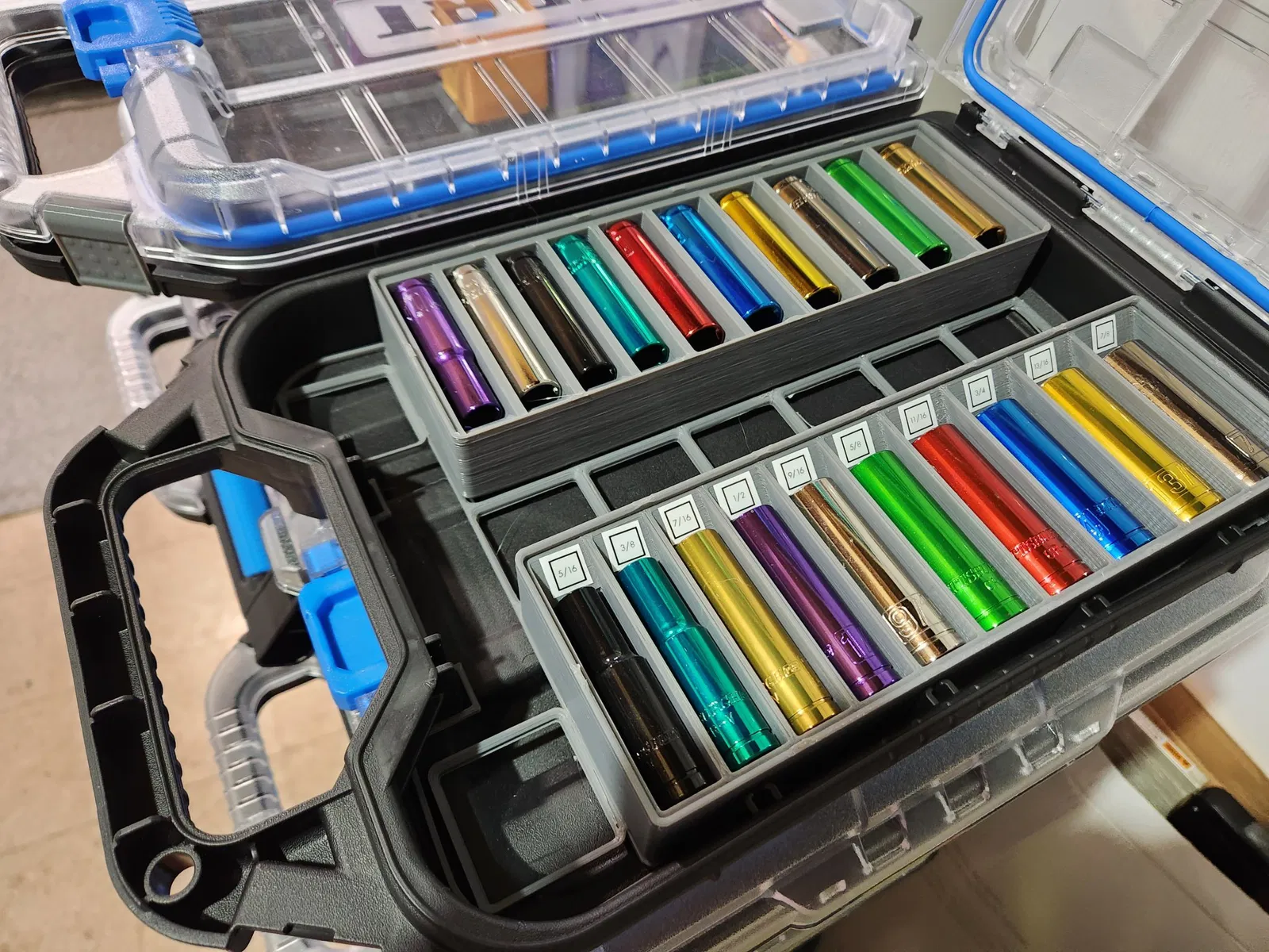 Các tệp STL/STEP được bao gồm là cụ thể cho bộ socket của Harbor Freight 69344 (SAE)69346 (metric), chúng có thể phù hợp với bộ của bạn nhưng tôi khuyên bạn nên tải xuống tệp tham số và tùy chỉnh các tham số để phù hợp hoàn hảo với các socket của bạn.