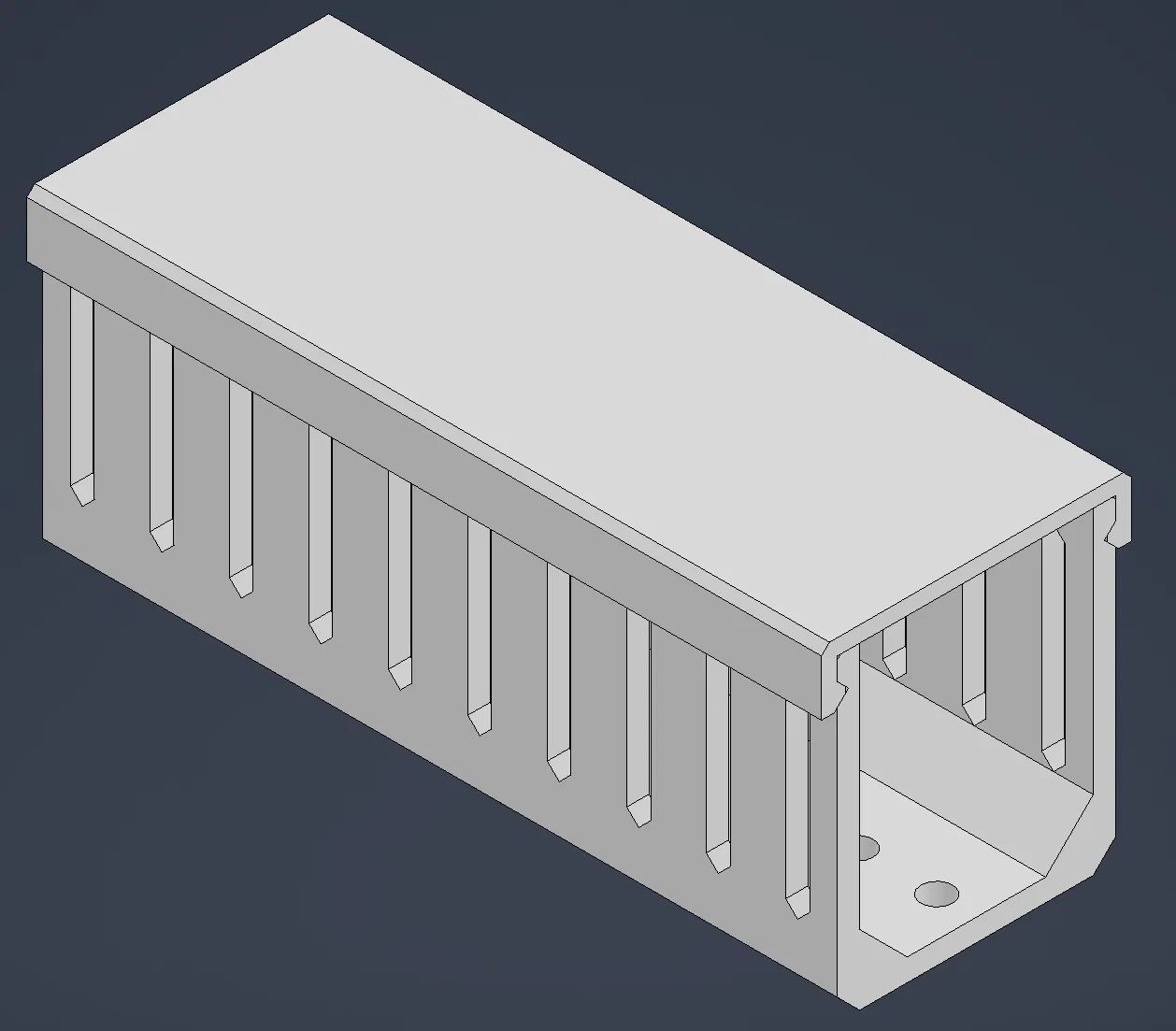Máng cáp dài 100mm với lỗ bắt vít 4mm. Thiết kế này được lấy cảm hứng từ hệ thống dẫn dây kiểu Panduit. Kích thước tổng thể: Chiều rộng - 1.5 inch (39mm); Chiều cao - 1.6 inch (42mm); Chiều dài - 4 inch (100mm). Đã bao gồm file STEP để các bạn tiện chỉnh sửa.
