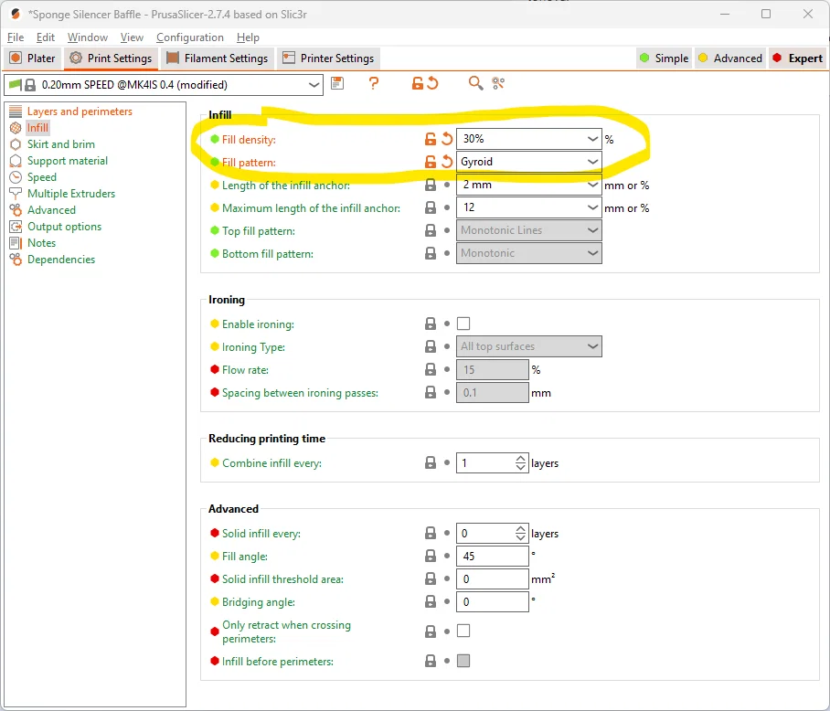 Thay vì tăng mật độ infill, bạn có thể thử giảm độ rộng đường in (extrusion width) từ 0,45 xuống 0,4 hoặc thấp hơn. Nó sẽ làm lớp "xốp" mịn hơn và hiệu quả hơn, nhưng cũng giòn hơn.