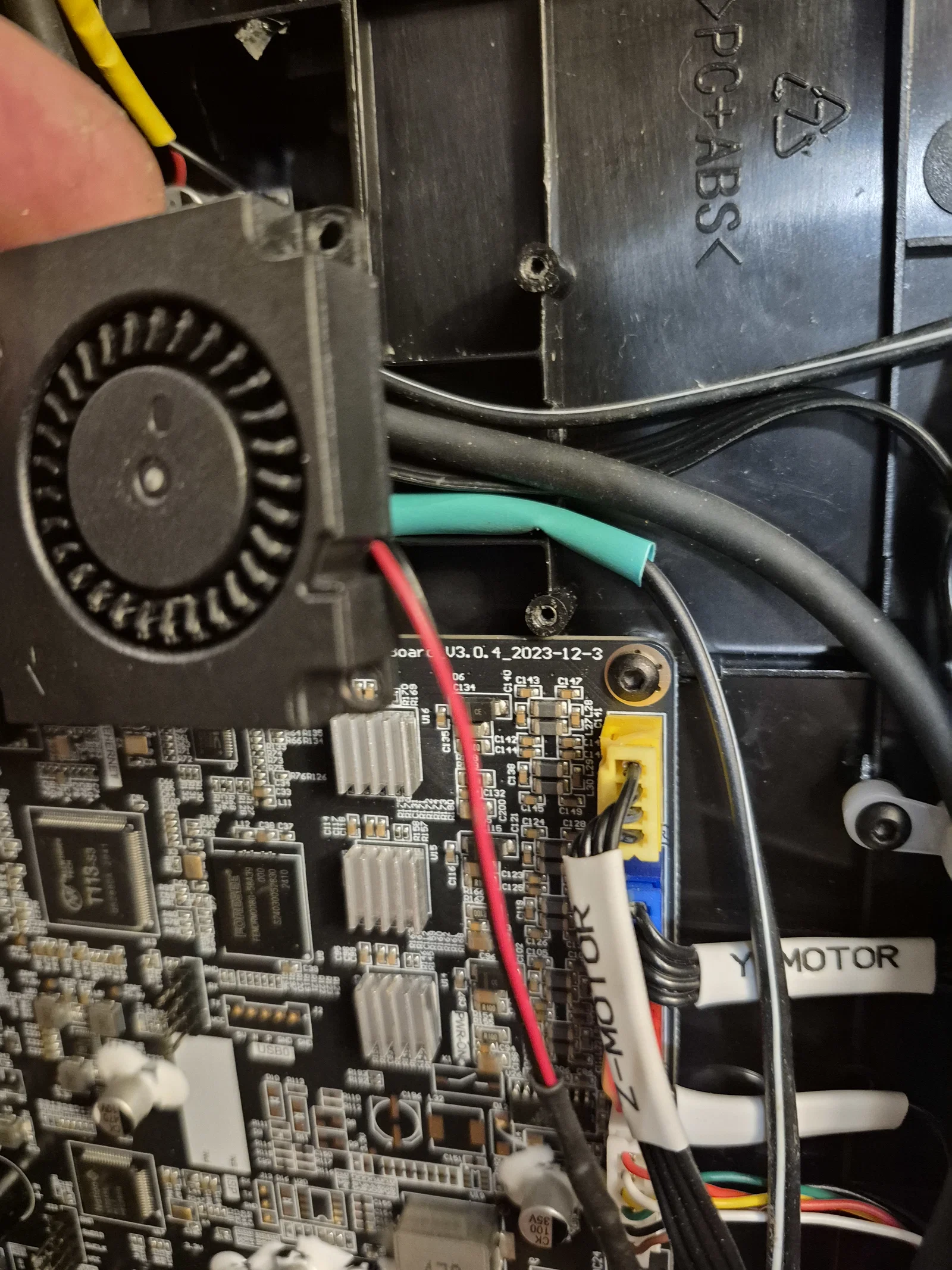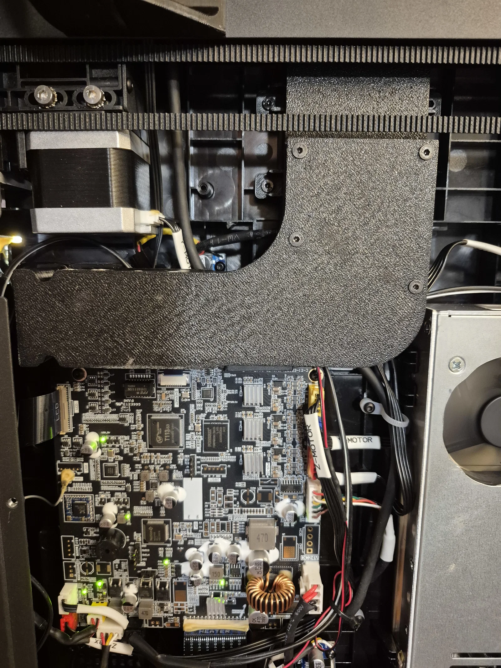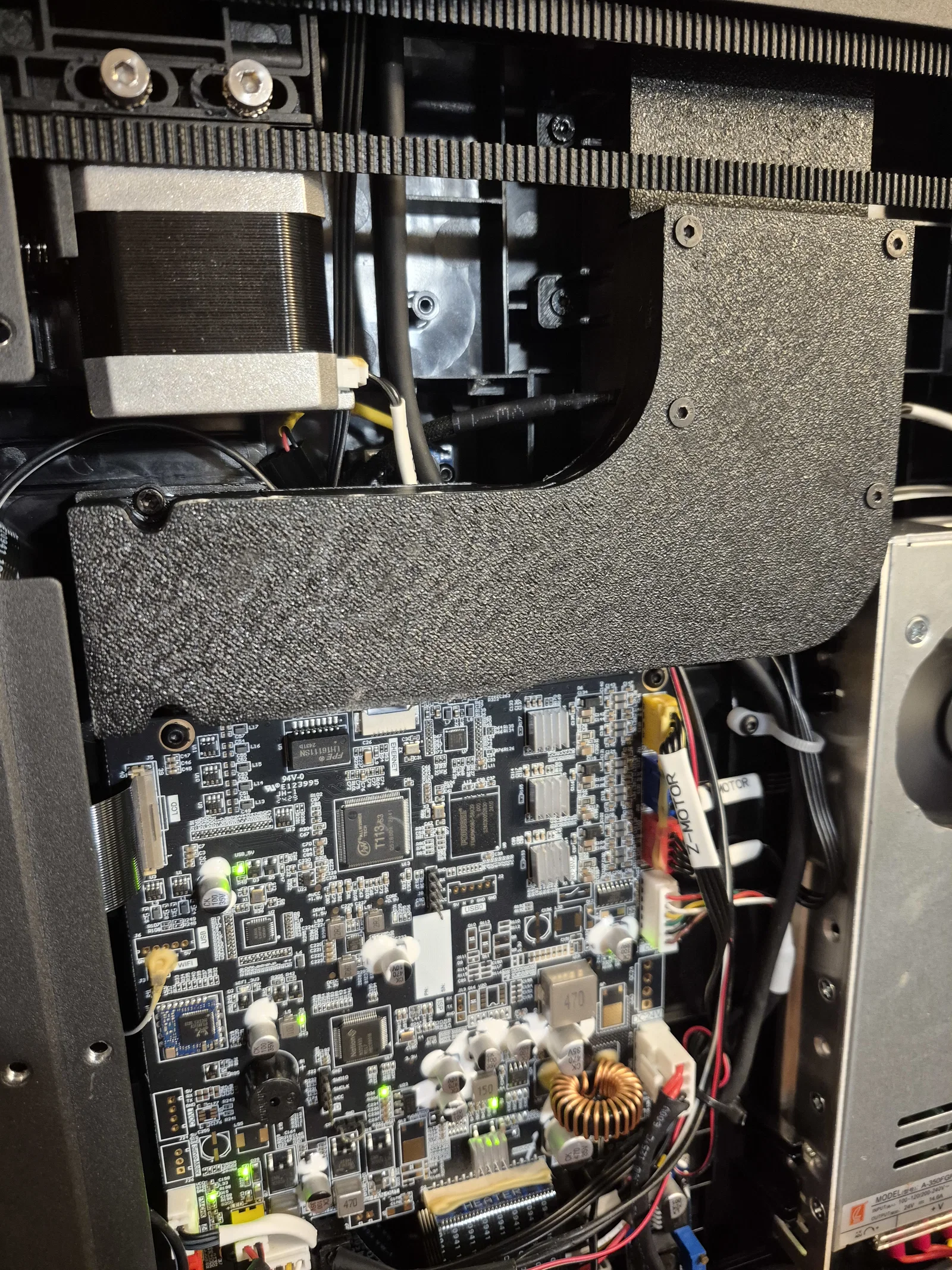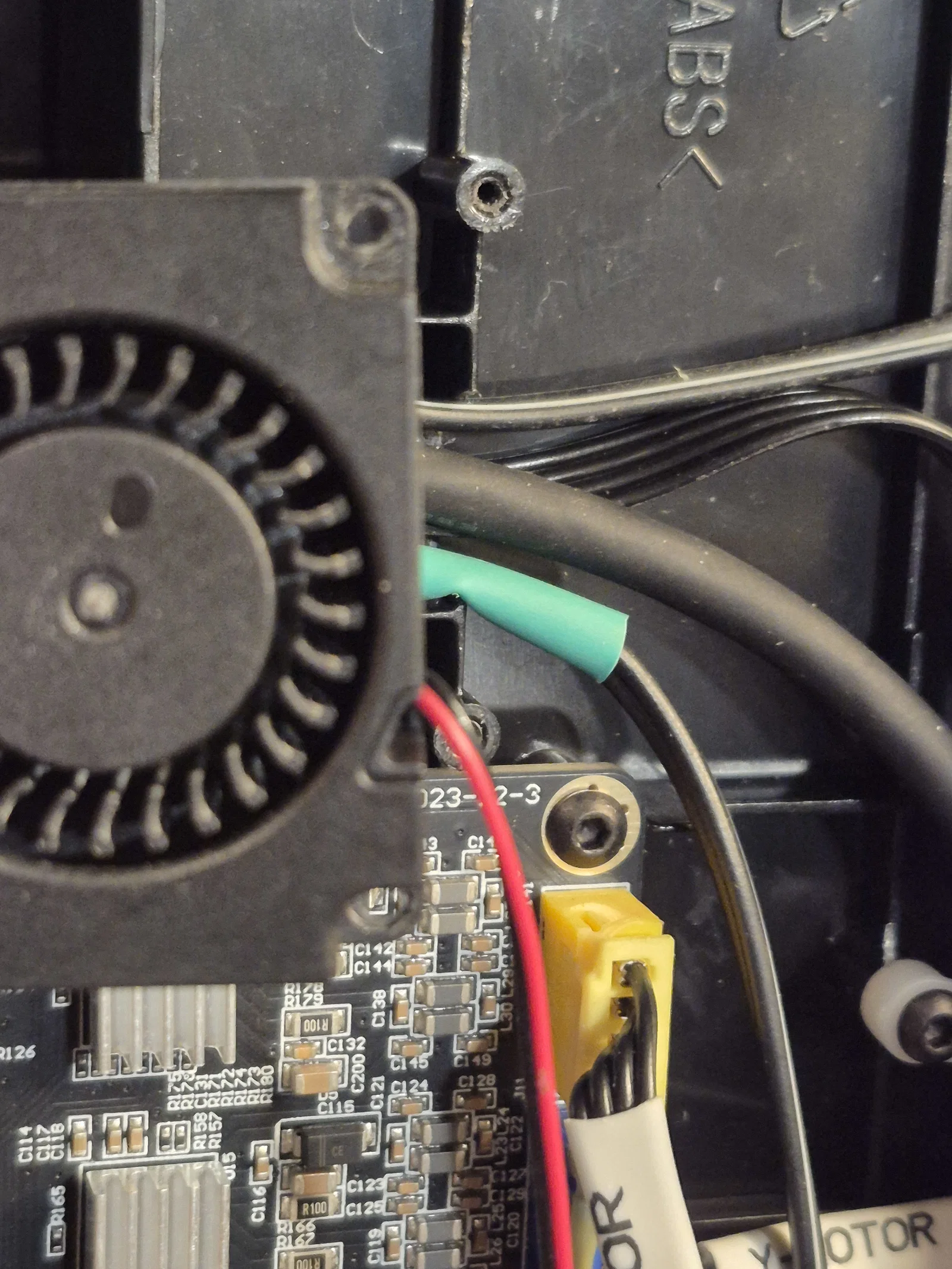 Khi lắp đặt, bạn cần đi lại dây để tránh bị vướng vào dây curoa hay quạt mainboard, nhất là dây extruder, cảm biến hết nhựa và trục Y. Cách tốt nhất mình tìm ra là cắt một phần gờ nhựa ABS dưới quạt mainboard để đi dây xuống dưới đó.