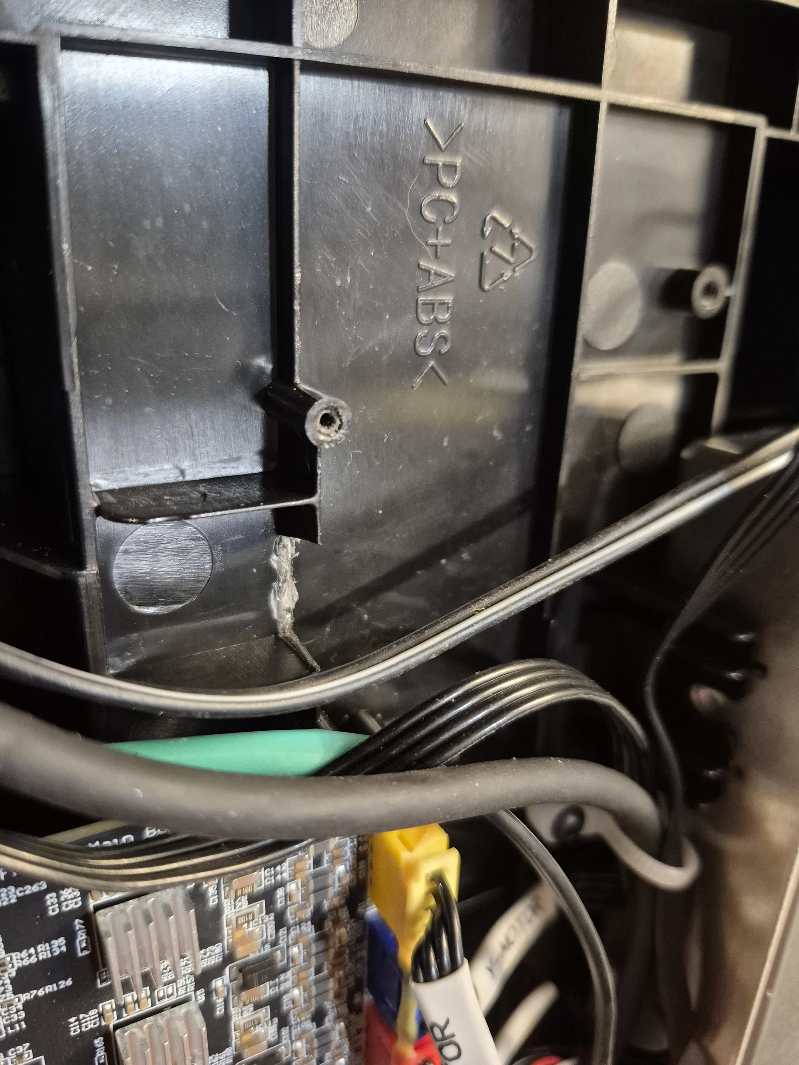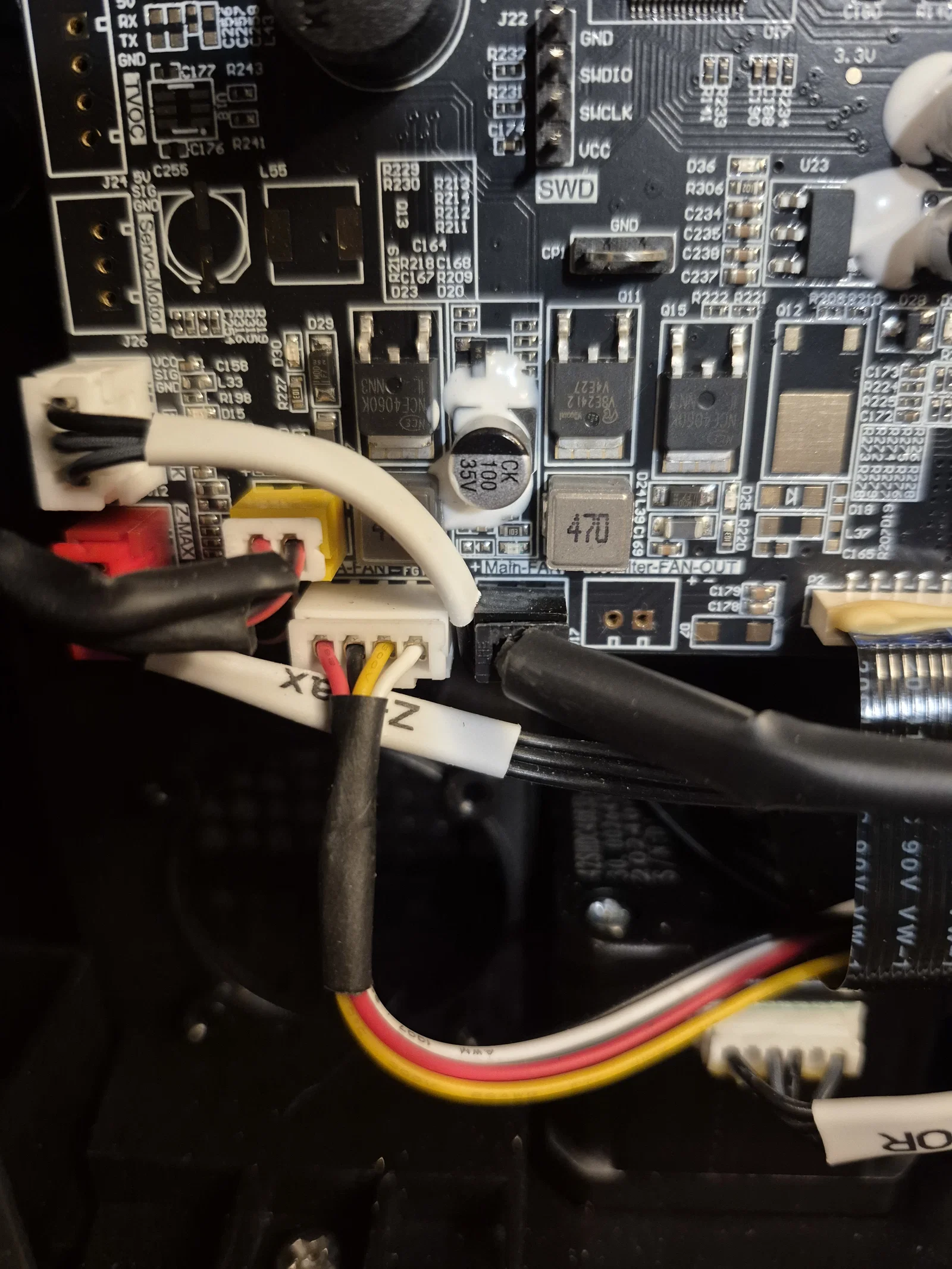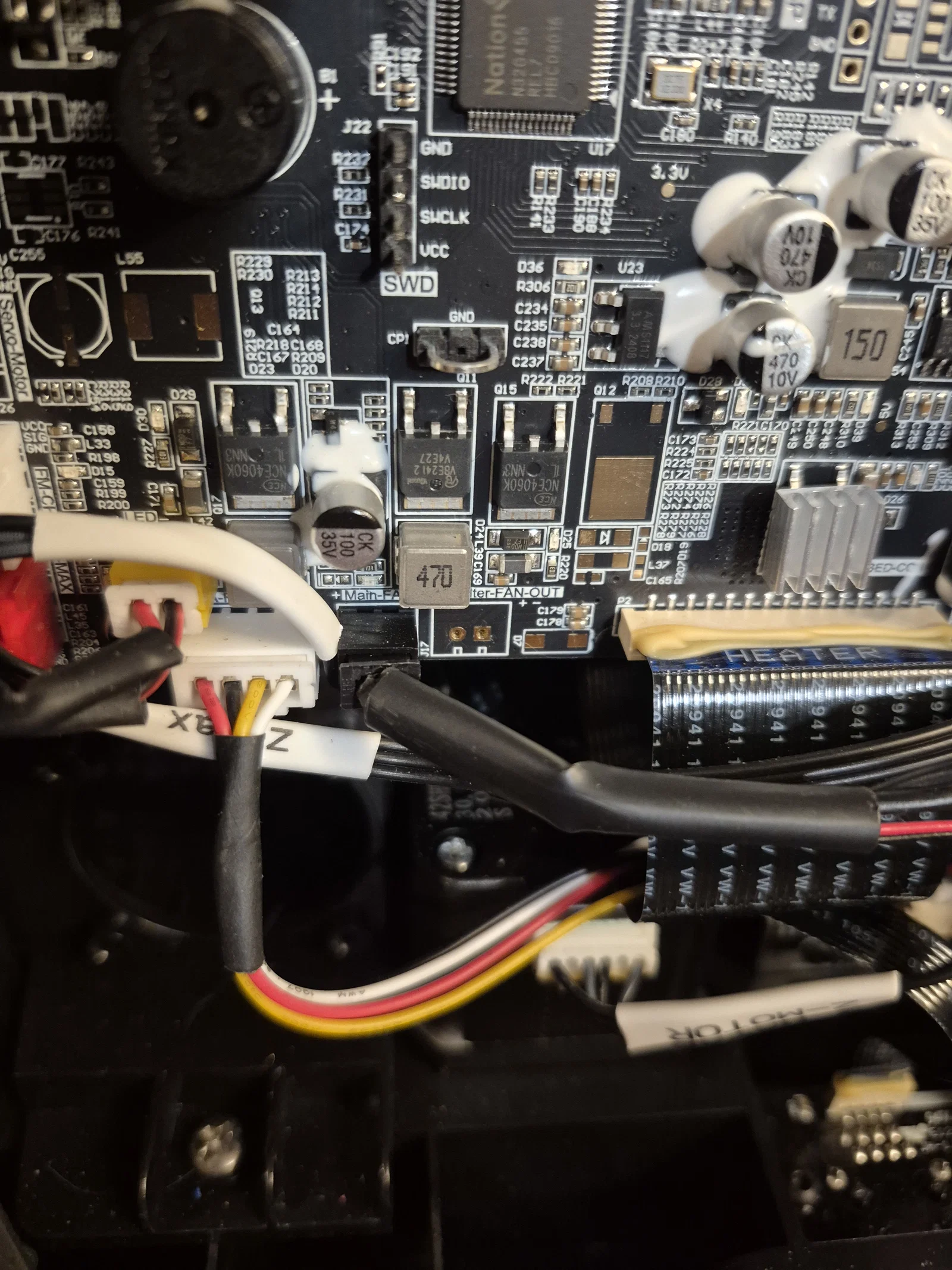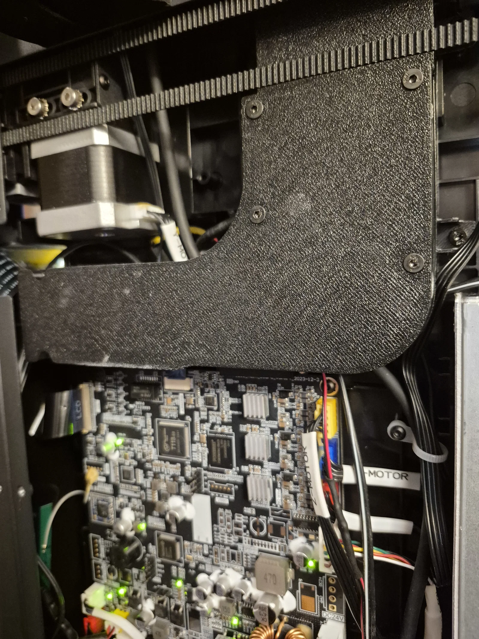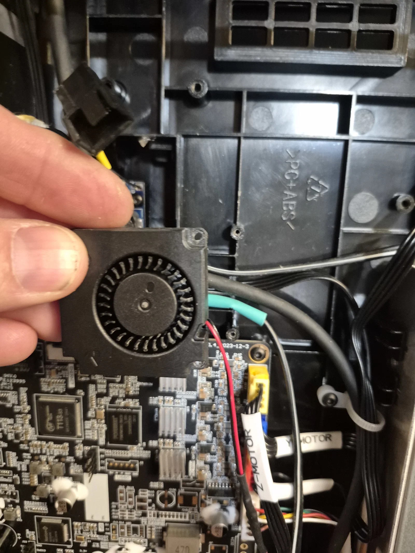 Khi lắp đặt, bạn cần đi lại dây để tránh bị vướng vào dây curoa hay quạt mainboard, nhất là dây extruder, cảm biến hết nhựa và trục Y. Cách tốt nhất mình tìm ra là cắt một phần gờ nhựa ABS dưới quạt mainboard để đi dây xuống dưới đó.