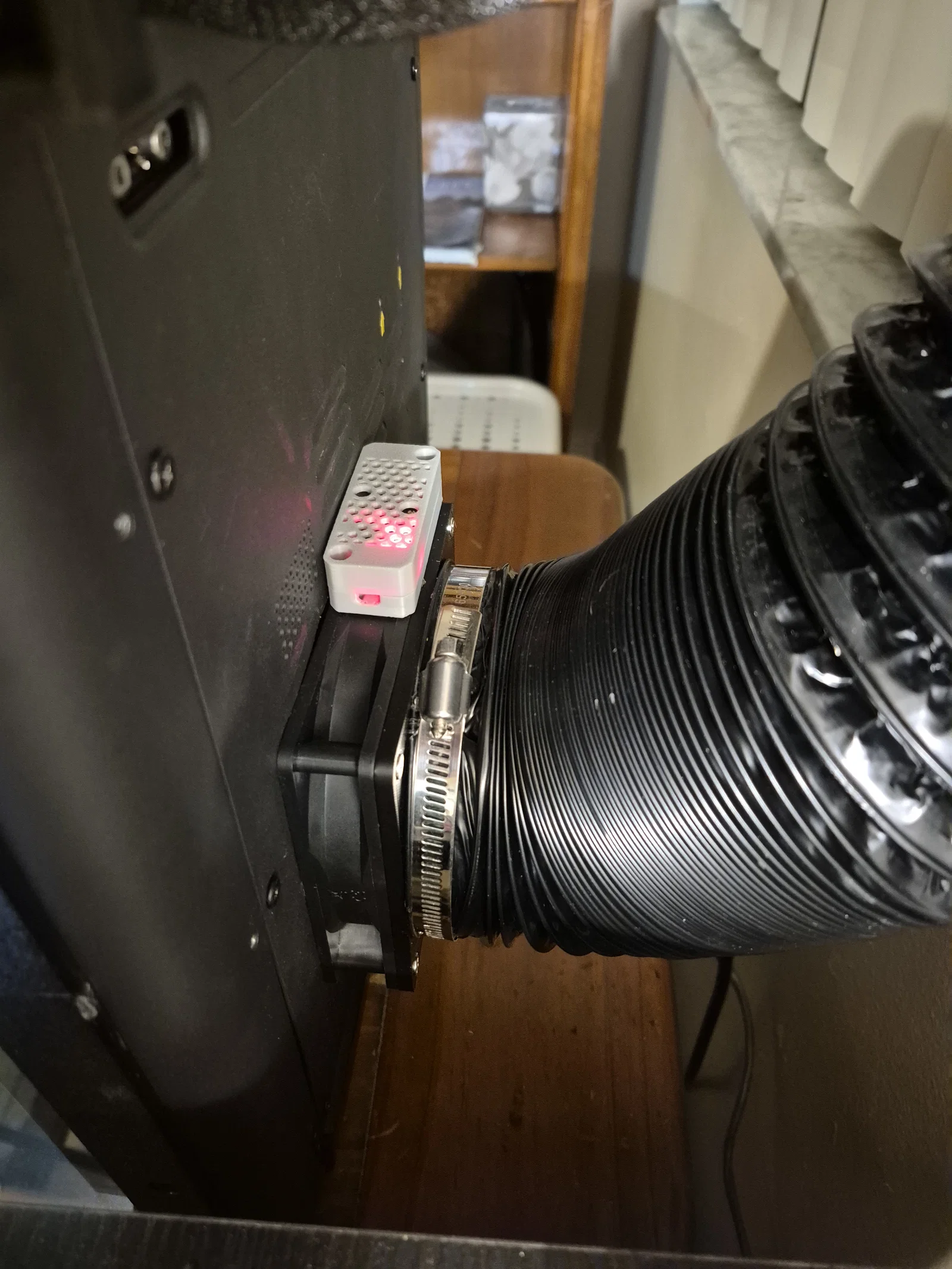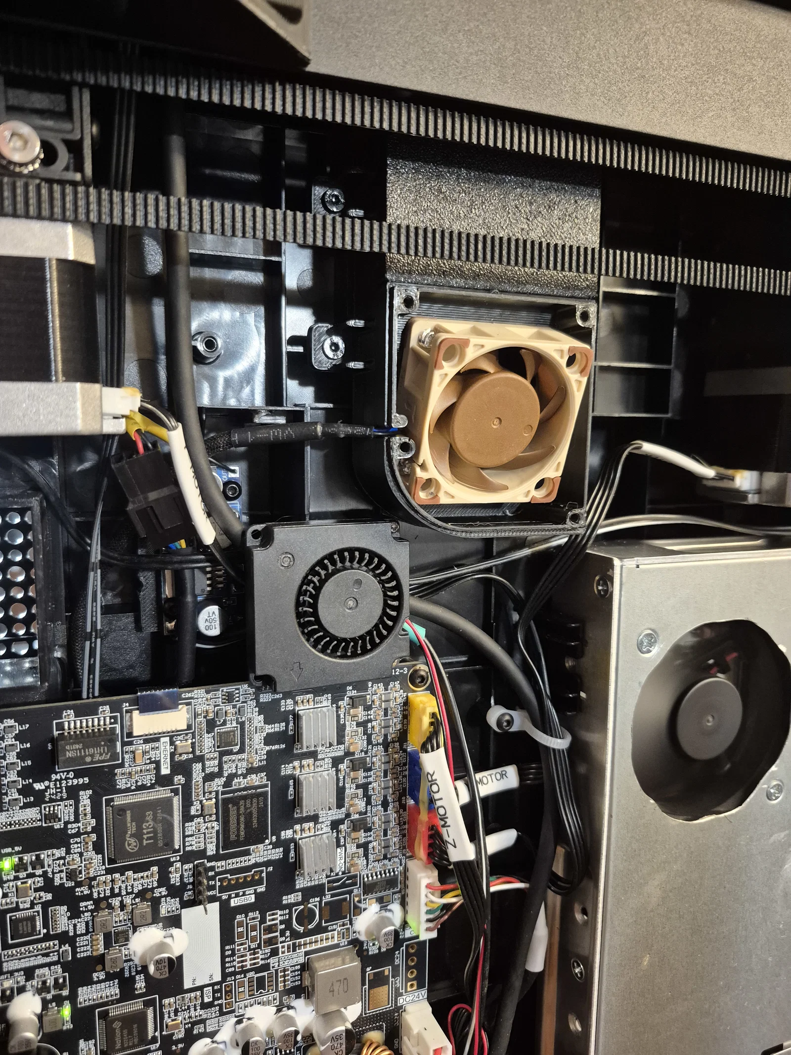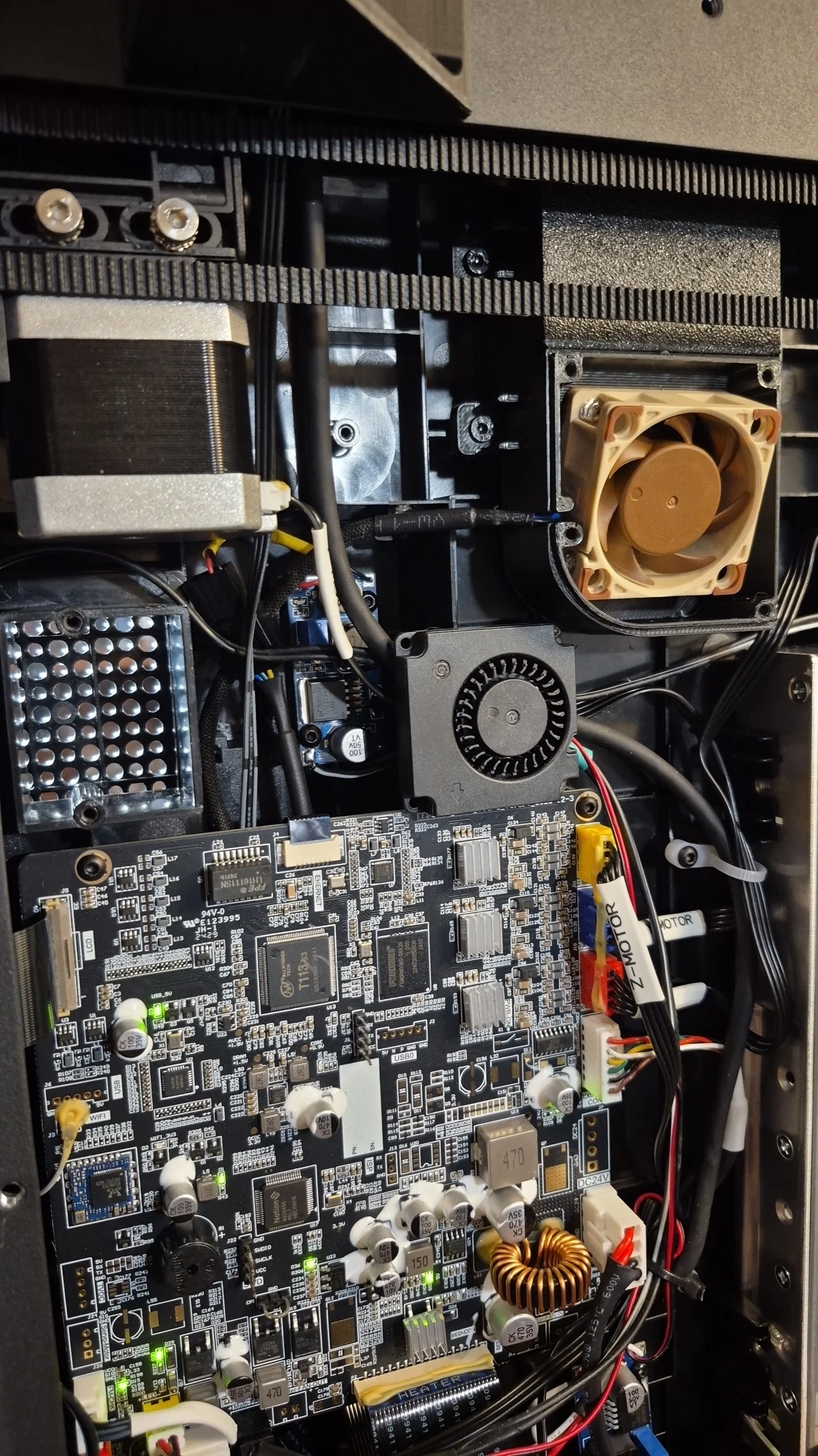 Đối với quạt, mình đã chuyển đổi từ thiết kế 5020 gốc sang quạt Noctua 40mm x 20mm (12V) vì mình đang có sẵn. Mình biết quạt hướng trục (axial fan) không tối ưu bằng quạt lồng sóc (blower) cho áp suất tĩnh của ống dẫn, nên có thể sẽ nâng cấp sau. Để cấp nguồn, mình dùng mạch hạ áp LM2596 (loại nào cũng được, link tham khảo) để hạ điện áp 24V từ cổng quạt tản nhiệt driver motor xuống 12V, giúp quạt tuần hoàn chỉ chạy khi máy đang in. Mình có chỉnh sửa lại ngàm giữ mạch của Design8Studio và dán bằng băng dính hai mặt vào khung máy. Mọi người xem ảnh để thấy vị trí gắn mạch và chỗ đi dây nhé.