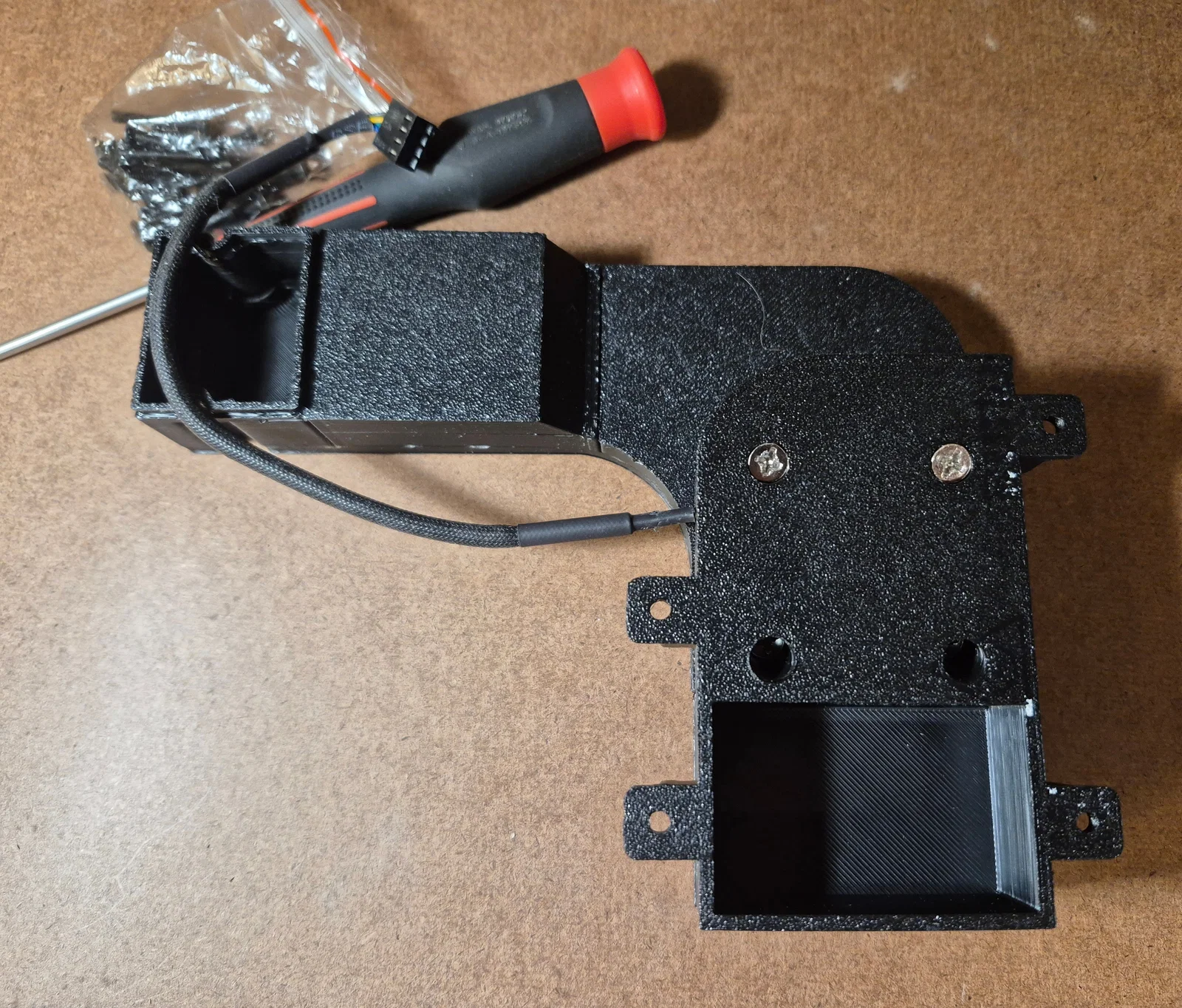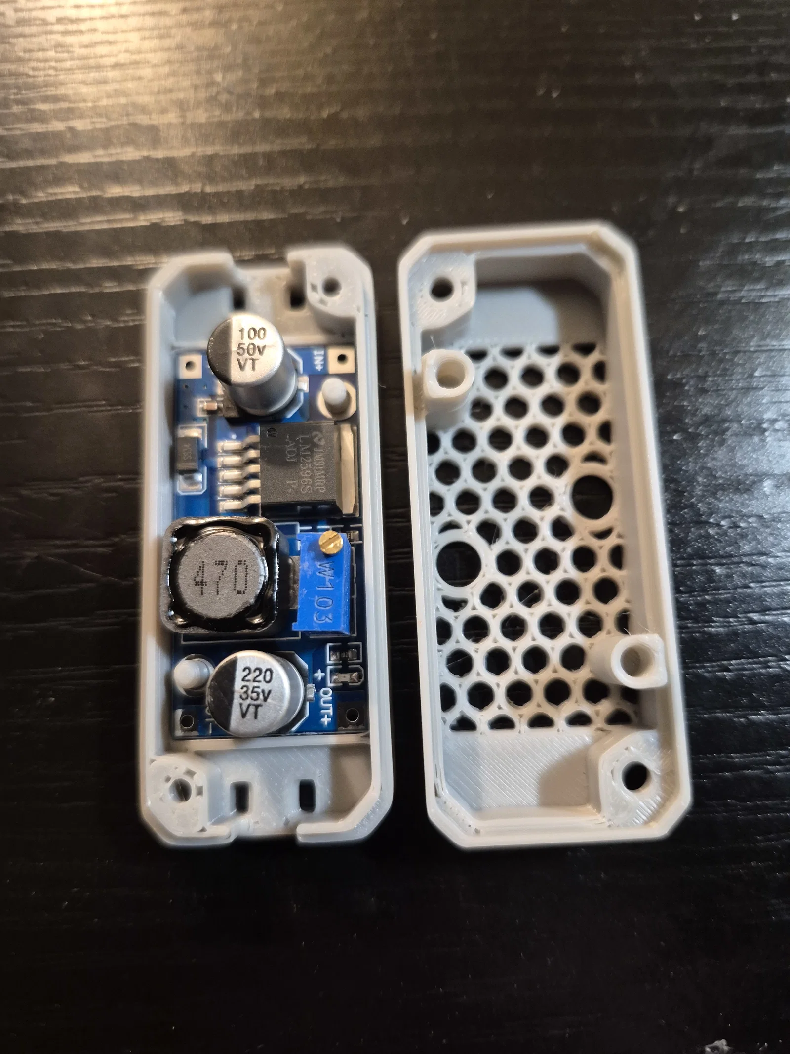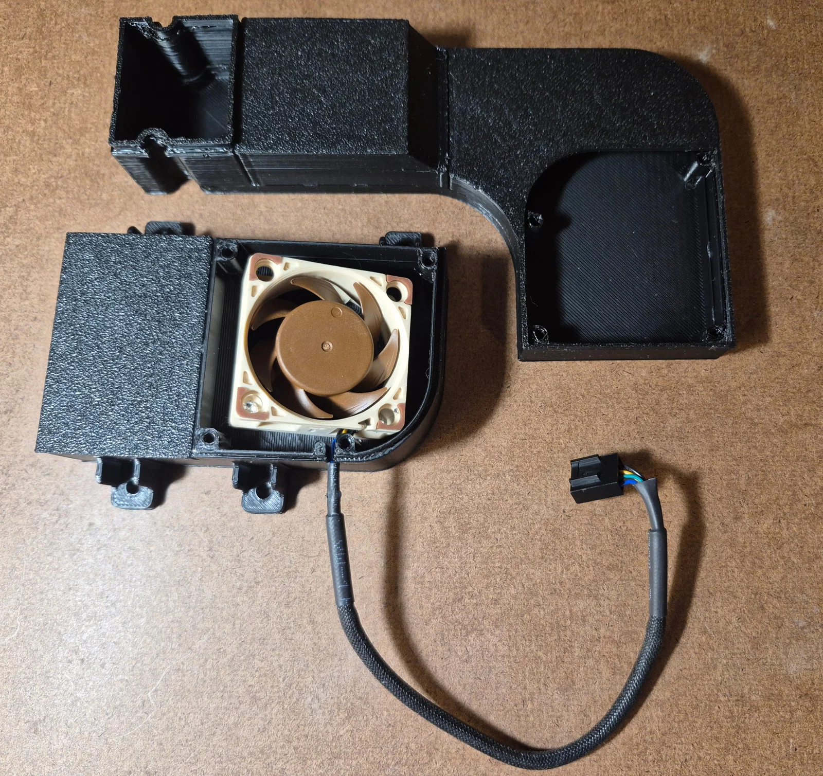 Đối với quạt, mình đã chuyển đổi từ thiết kế 5020 gốc sang quạt Noctua 40mm x 20mm (12V) vì mình đang có sẵn. Mình biết quạt hướng trục (axial fan) không tối ưu bằng quạt lồng sóc (blower) cho áp suất tĩnh của ống dẫn, nên có thể sẽ nâng cấp sau. Để cấp nguồn, mình dùng mạch hạ áp LM2596 (loại nào cũng được, link tham khảo) để hạ điện áp 24V từ cổng quạt tản nhiệt driver motor xuống 12V, giúp quạt tuần hoàn chỉ chạy khi máy đang in. Mình có chỉnh sửa lại ngàm giữ mạch của Design8Studio và dán bằng băng dính hai mặt vào khung máy. Mọi người xem ảnh để thấy vị trí gắn mạch và chỗ đi dây nhé.
