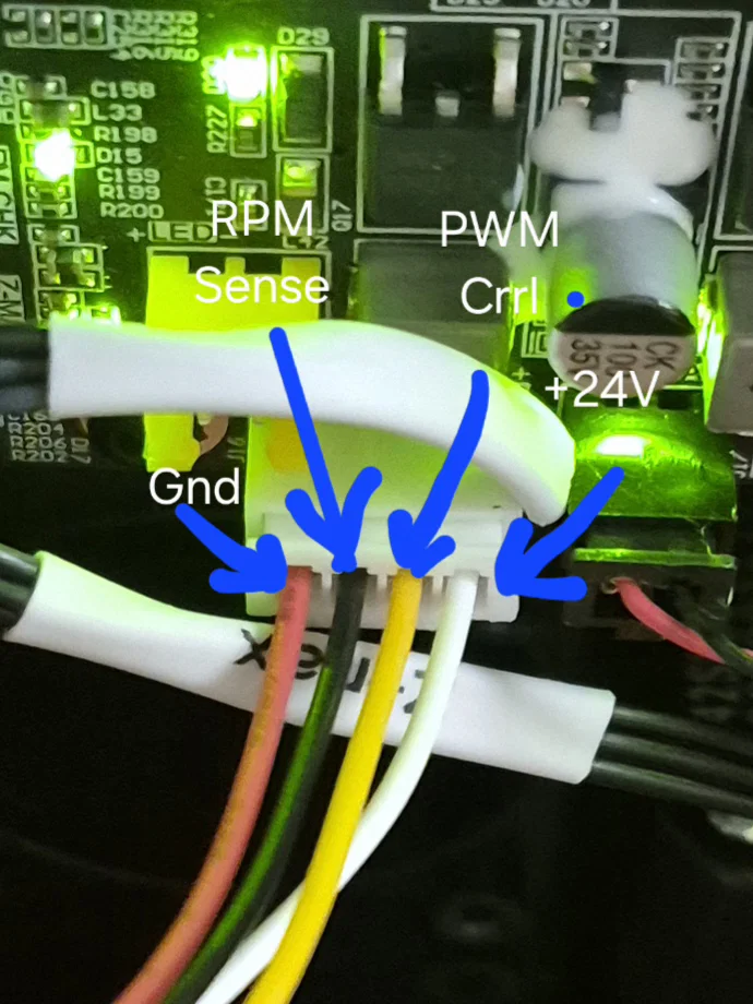 Mình quyết định chạy quạt hút trực tiếp từ nguồn 24V của máy để nó chạy liên tục. Do firmware AD5M chỉ bật quạt AUX sau khi in xong layer đầu và dừng khi kết thúc, nên nếu in ABS/ASA mình muốn quạt hút chạy xuyên suốt. Tuy nhiên, ưu điểm của cổng AUX là cho phép điều khiển tốc độ qua Orca, nhưng cần lưu ý cổng này là 24V và có sơ đồ chân khác với quạt PC tiêu chuẩn nên cần cẩn thận khi đấu nối.