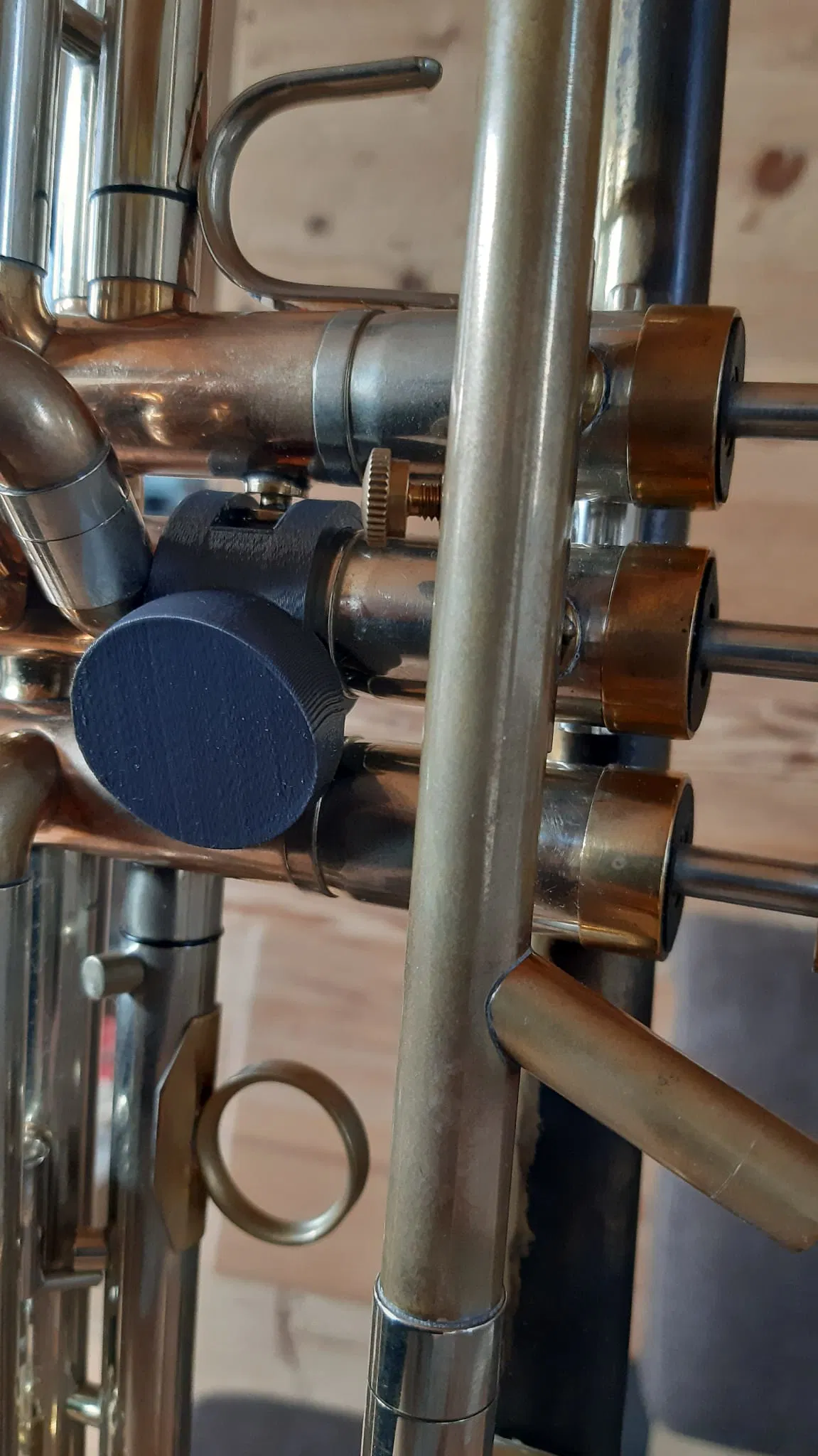 Cái kẹp này được thiết kế để gắn trực tiếp lên một trong những ống van của kèn Trumpet (đường kính ống trong trường hợp này là 20,48mm). Sau đó, bạn có thể dán nút bấm Flic Button hoặc Flic Button 2 lên trên. Nhờ đó, bạn có thể nhấn nút dễ dàng và nhanh chóng trong khi đang chơi nhạc mà không cần phải vươn tay quá xa.