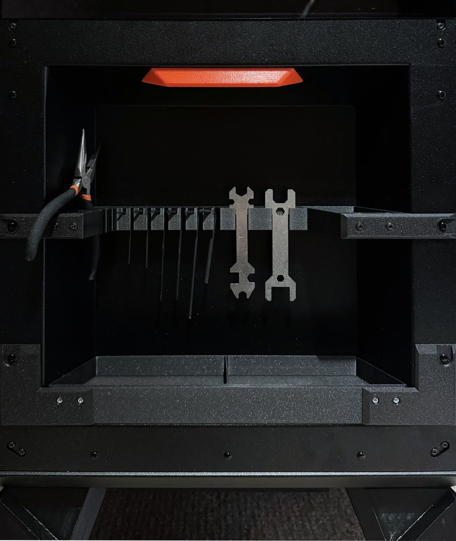 Giải pháp lưu trữ tối giản gắn hông cho Prusa CORE ONE mà không cần dùng nam châm. Thiết kế này sử dụng đinh tán nhựa, đi kèm các khay chứa đồ và giá treo dụng cụ linh hoạt, cho phép bạn tùy chỉnh và lắp ráp dễ dàng bằng ốc vít M3.