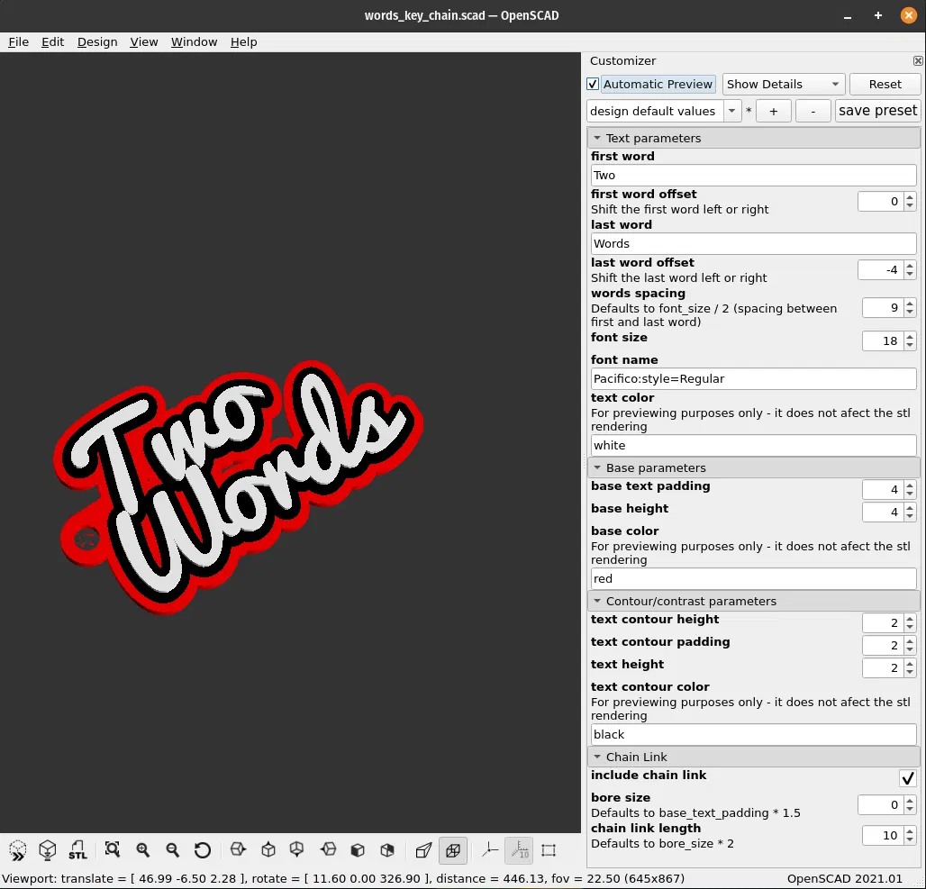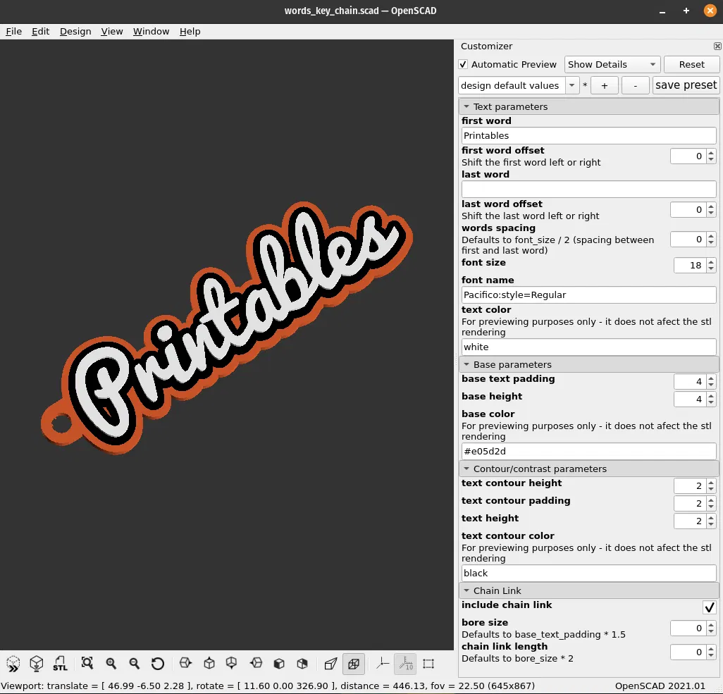 - Một số ký tự có thể bị lệch nhẹ do thiết kế font (ví dụ chữ “J”). Nếu vòng móc khóa không khớp hoàn toàn với chữ, bạn chỉ cần chỉnh lại giá trị _first_word_offset và chain_link_length_.