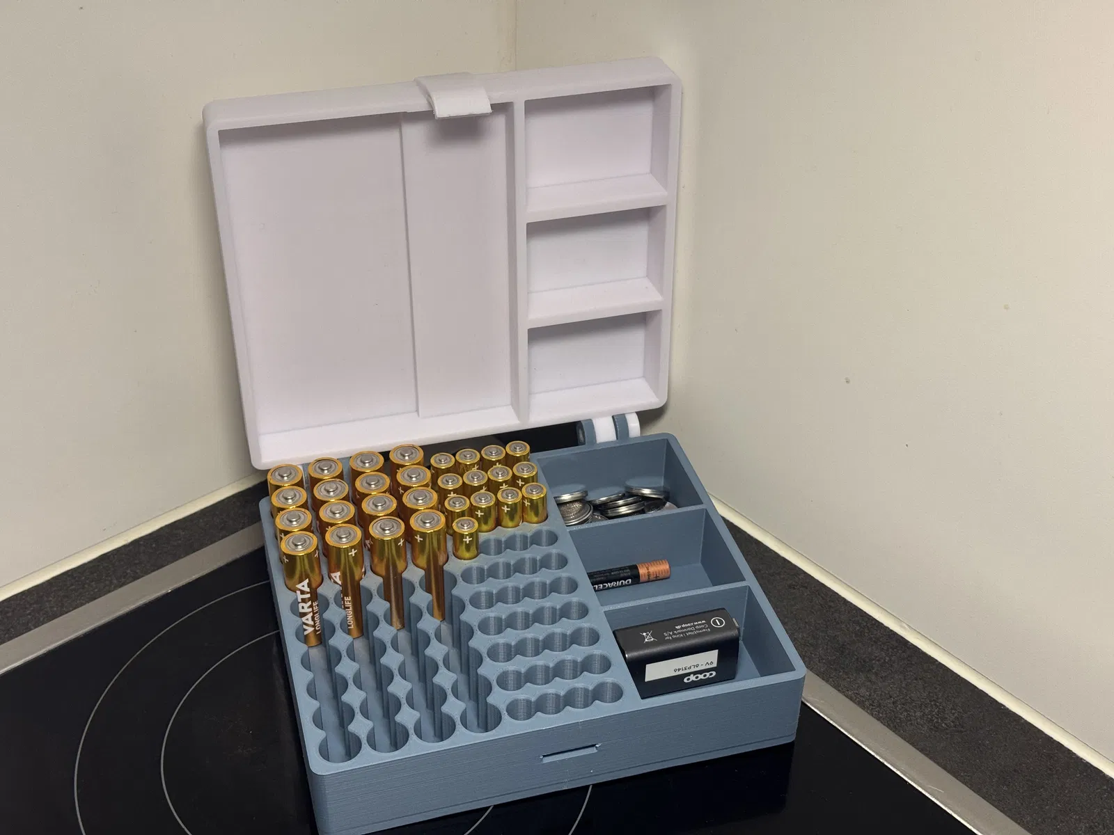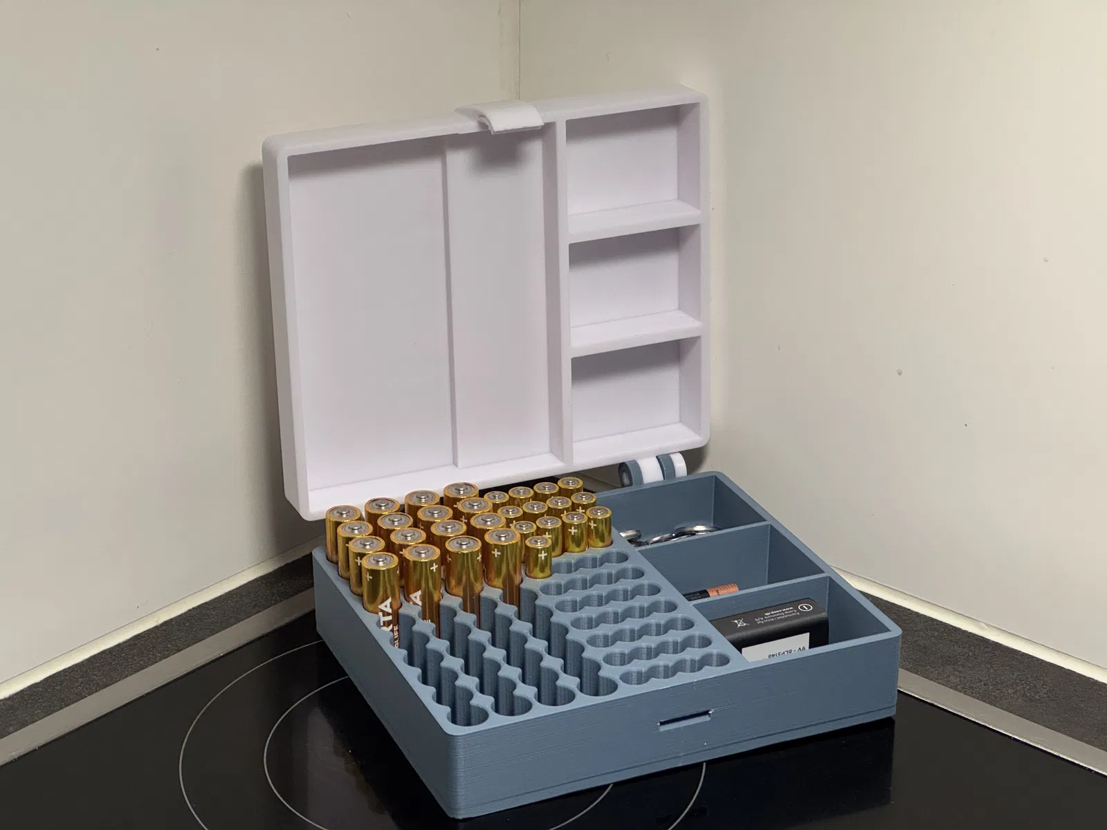 Cái hộp đựng pin này có thiết kế rất tinh tế và thông minh, giúp các bạn sắp xếp pin ngăn nắp và dễ tìm hơn nhiều. Hộp được thiết kế chuyên dụng cho pin AA và AAA với các khe cắm vừa vặn để giữ pin chắc chắn. Ngoài ra, hộp còn có thêm 3 ngăn rời để bạn thoải mái chứa các loại pin khác như 9V, C, D hoặc pin cúc áo, mang lại sự linh hoạt để lưu trữ đủ loại pin tại cùng một nơi.
