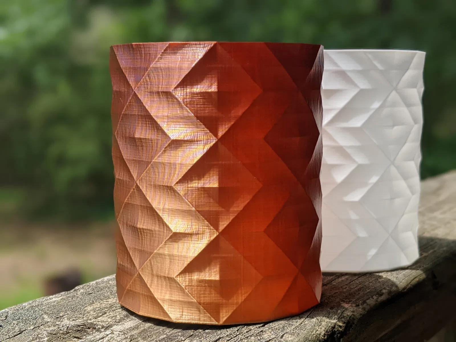 Đây là mẫu bình hoa có họa tiết độc đáo, tinh tế, rất dễ để lộ ra các VFA (Vertical Fine Artifacts - các đường vân nhiễu dọc) trên máy in của bạn. Mình đã sử dụng các thiết lập vase mode tiêu chuẩn trên hai máy in khác nhau để tạo ra các mẫu vật trong ảnh. Chiếc bình màu đỏ ánh kim được in bằng máy Anycubic Kobra Neo với bánh xe v-slot kim loại. Vì loại bánh xe này không có khả năng bù trừ các rung động hài hòa thường xảy ra ở động cơ bước, nên mình thu được một chiếc bình có bề mặt cực kỳ ấn tượng về mặt thị giác. Kết quả của bạn chắc chắn sẽ khác biệt đấy! Bạn có thể xem thêm các mẫu bình hoa khác của mình tại đây: my other vase designs!