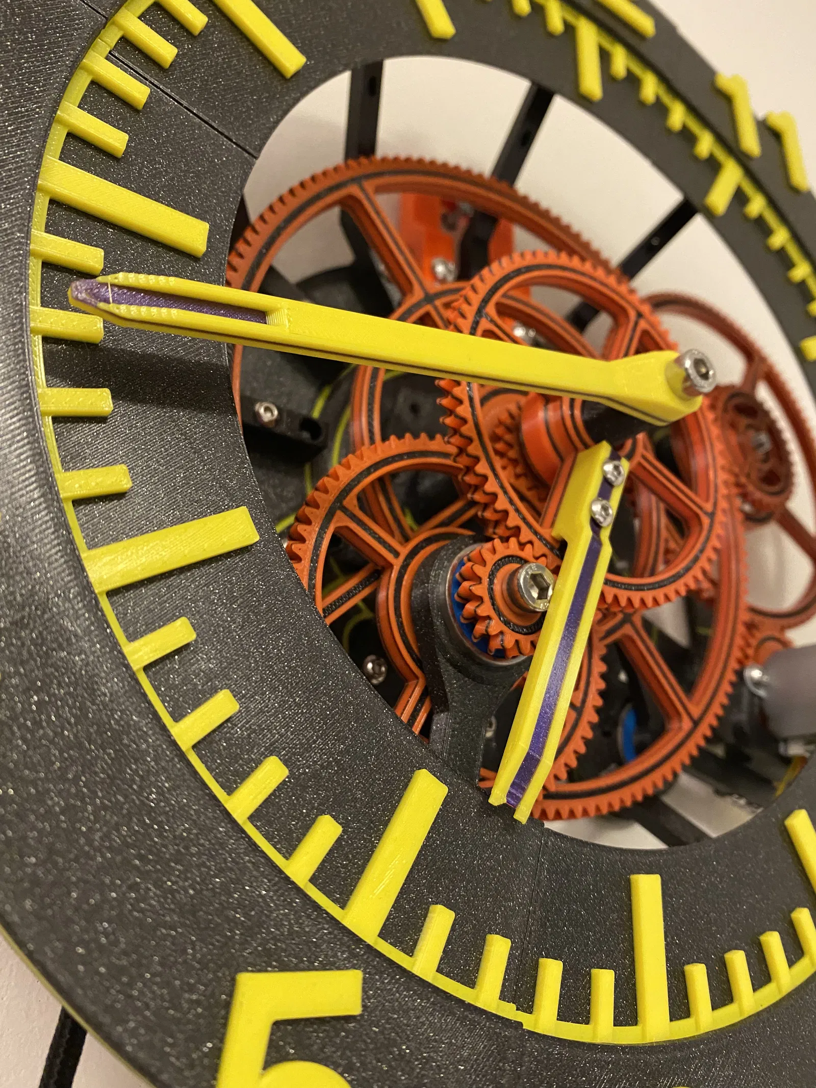 Nhiều chi tiết được thiết kế để in hai màu bằng lệnh M600 (thay sợi nhựa giữa chừng) nhờ vào các đường nét bậc thang (chủ yếu là bánh răng và mặt đồng hồ). Về vật liệu, bạn có thể in tất cả bằng PLA. Riêng mình thì in phần treo tường (M25), kẹp cáp (M28) và chân đế (M26, M27) bằng PETG. Các chi tiết còn lại mình in bằng nhựa PLA màu Galaxy Black và Pineapple Yellow.