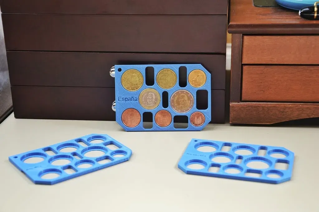 Một bộ đựng đồng euro với tên của mỗi quốc gia. Bạn có tất cả 23 quốc gia thực tế trong các tệp stl bên trong tệp zip (phiên bản tiếng Anh và tiếng Tây Ban Nha)