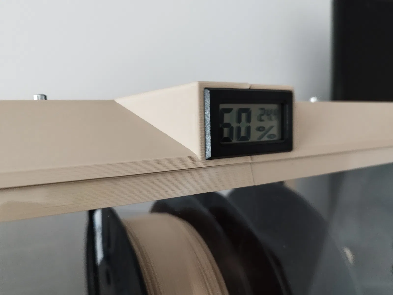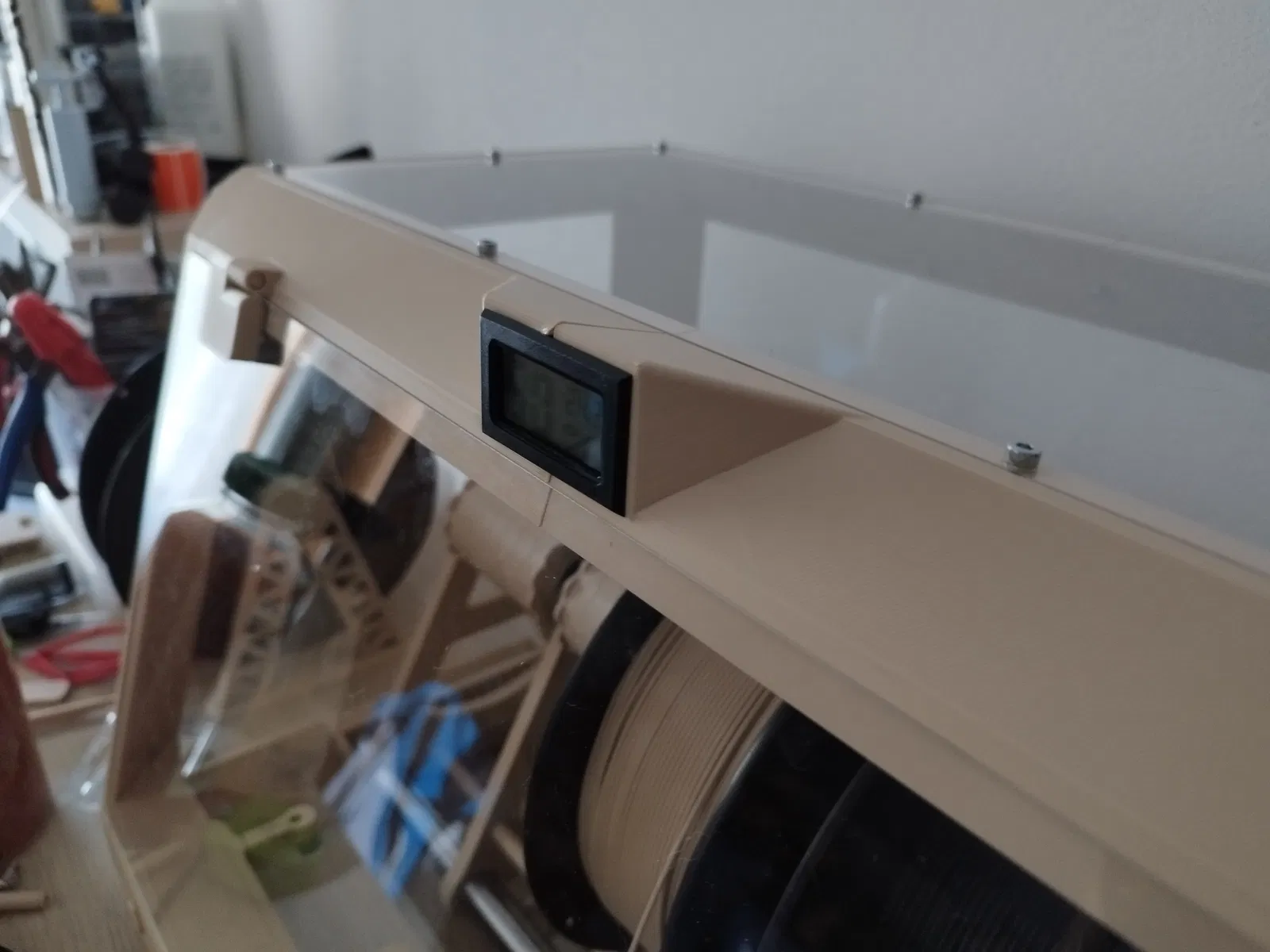 Trong thiết kế gốc, phần lỗ lắp ẩm kế kèm nhiệt kế bị nghiêng quá nhiều. Do độ nghiêng lớn, màn hình gần như không thể nhìn rõ khi đặt hộp ở vị trí cao. Hiện tại, màn hình đã hiển thị rất dễ đọc ngay cả khi đặt hộp ở trên cao. Trong trường hợp của mình, màn hình nằm ở độ cao khoảng 185 cm.