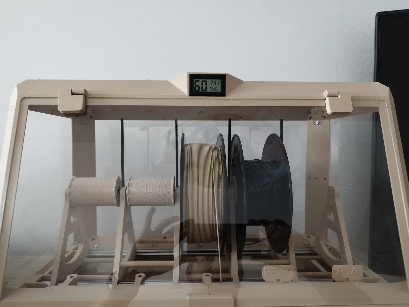 Bản remix các chi tiết G1 và G2 cho ẩm kế kèm nhiệt kế của Prusa Drybox. Thiết kế này giúp điều chỉnh độ nghiêng để dễ quan sát màn hình hơn khi hộp được đặt ở vị trí cao, cùng với các bổ sung móc cài cửa tiện lợi.