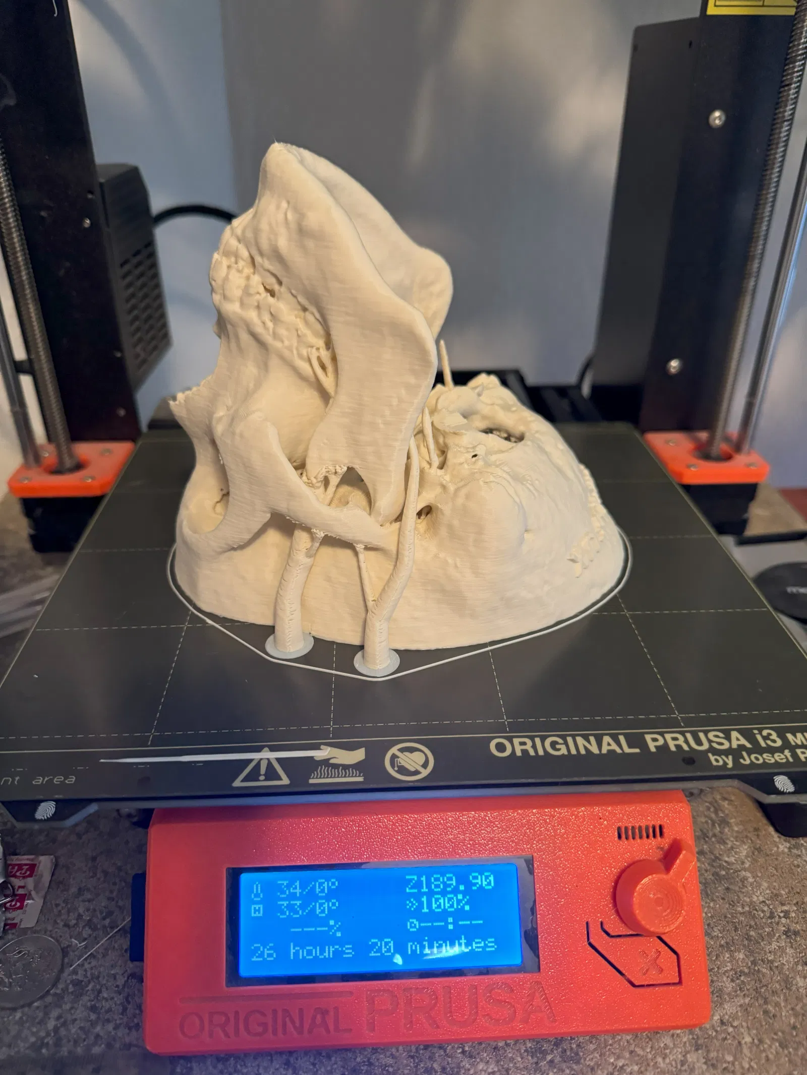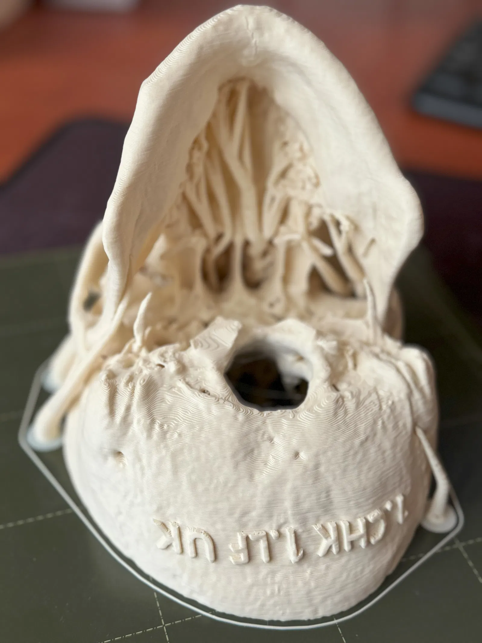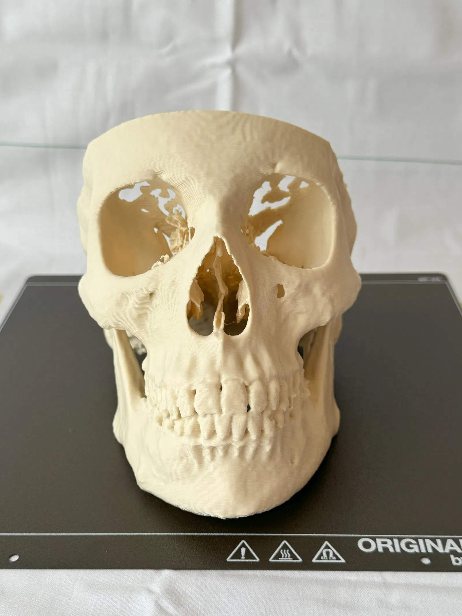 Mô hình hộp sọ người được tạo ra bằng cách chuyển đổi trực tiếp từ phim chụp CT. Một vị bác sĩ nổi tiếng thế giới (và cũng là bạn thân của chúng tôi) đang làm việc trong lĩnh vực phẫu thuật đã cung cấp hộp sọ của cô ấy để phục vụ cho mục đích nghiên cứu. Mô hình này được tạo ra bằng cách chuyển đổi từ phim chụp CT, nghĩa là từ các tệp DICOM sang tệp STL. Khi in cần phải có hỗ trợ (supports), chúng tôi khuyên bạn nên dùng loại hỗ trợ dạng hữu cơ (organic supports). ------------------------------------------------------------------------------------------------------------