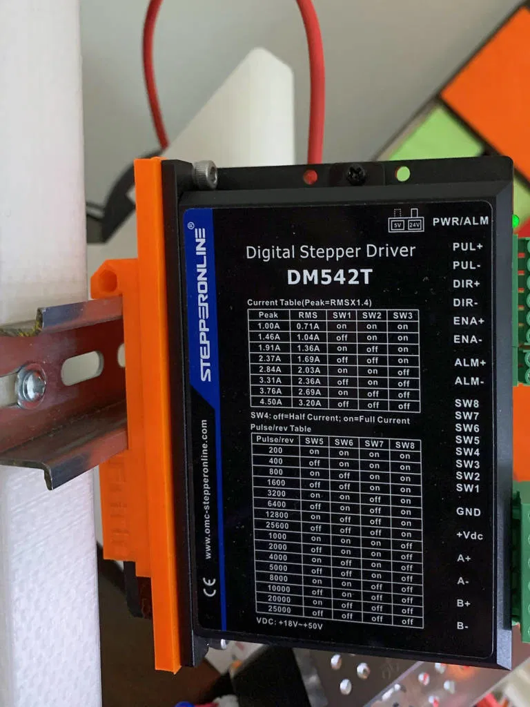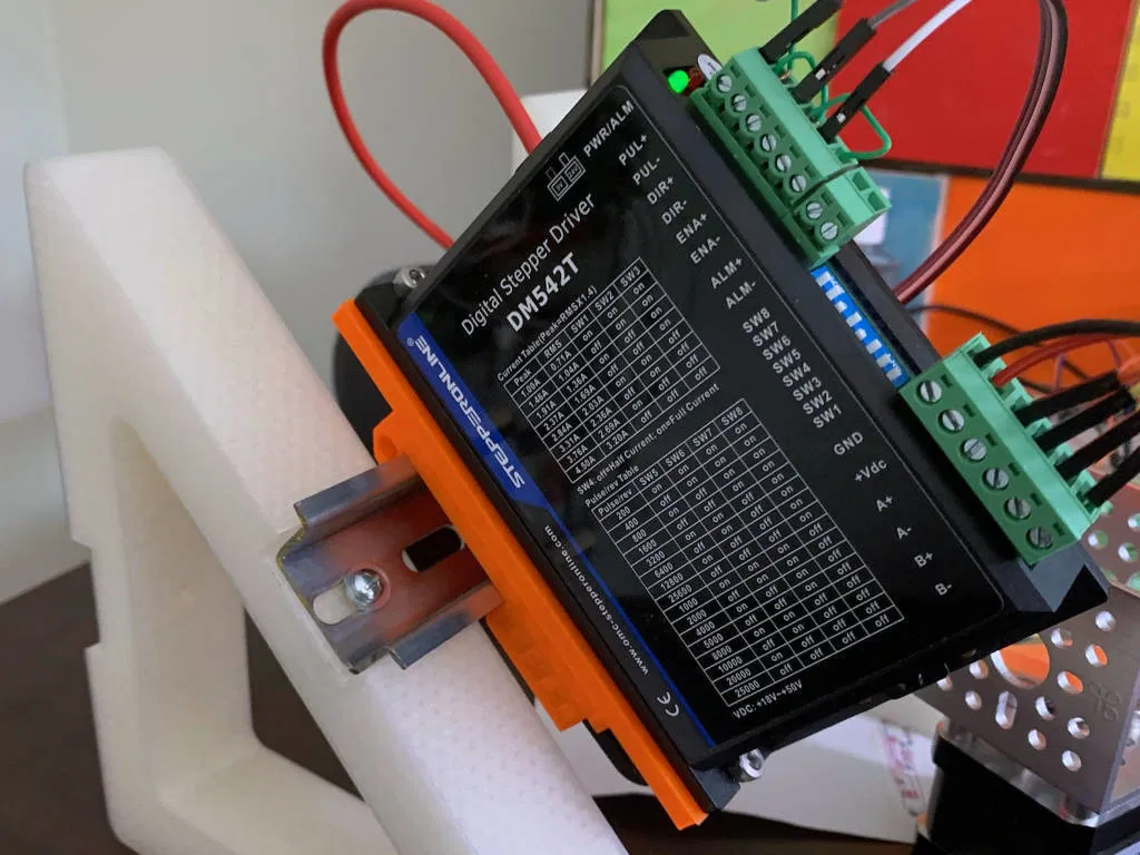 Mẫu ngàm hỗ trợ gắn driver DM542T lên thanh Din Rail chuẩn. Các lỗ ốc đã được thiết kế ren M4 sẵn. Lưu ý bạn cần in thêm lẫy kẹp đi kèm từ nguồn chia sẻ bên ngoài để hoàn thiện phần lắp ráp.