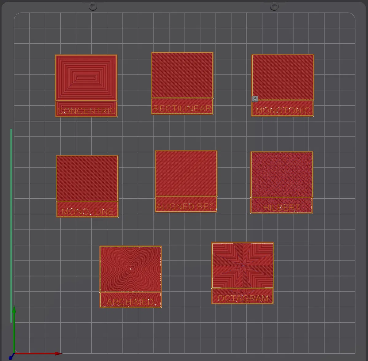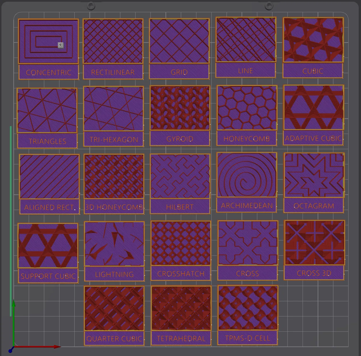 Bộ sưu tập này được thiết kế như một tài liệu trực quan, giúp người dùng nắm bắt nhanh chóng sự khác biệt giữa các kiểu infill từ phổ biến như Gyroid, Grid cho đến các kiểu chuyên dụng như Hilbert hoặc TPMS-D Cell. Với việc in ở cấu hình 10% infill, không có lớp vỏ trên cùng (0 top layers) và 2 lớp tường (2 walls), mẫu in này cho phép bạn nhìn rõ cấu trúc bên trong của từng loại hoa văn, từ đó đưa ra lựa chọn phù hợp nhất cho độ bền hoặc tính thẩm mỹ của sản phẩm cuối cùng.