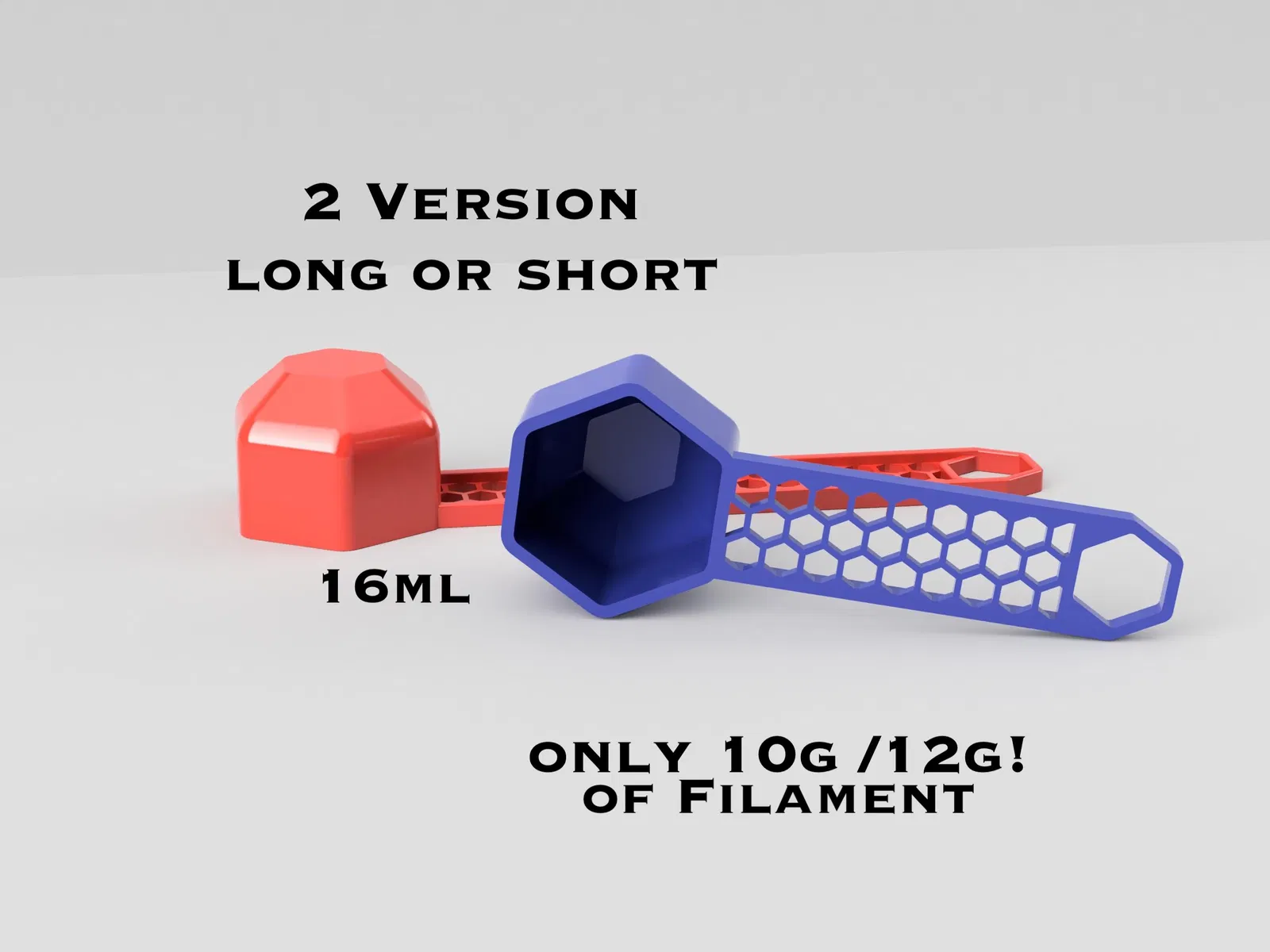 Mẫu muỗng cà phê hình lục giác độc đáo với dung tích 16ml. Thiết kế đi kèm 2 phiên bản cán dài 100mm và cán ngắn 60mm, giúp bạn dễ dàng đo lường định lượng cho tách cà phê của mình. Chỉ cần khoảng 10g - 12g nhựa để in xong sản phẩm.