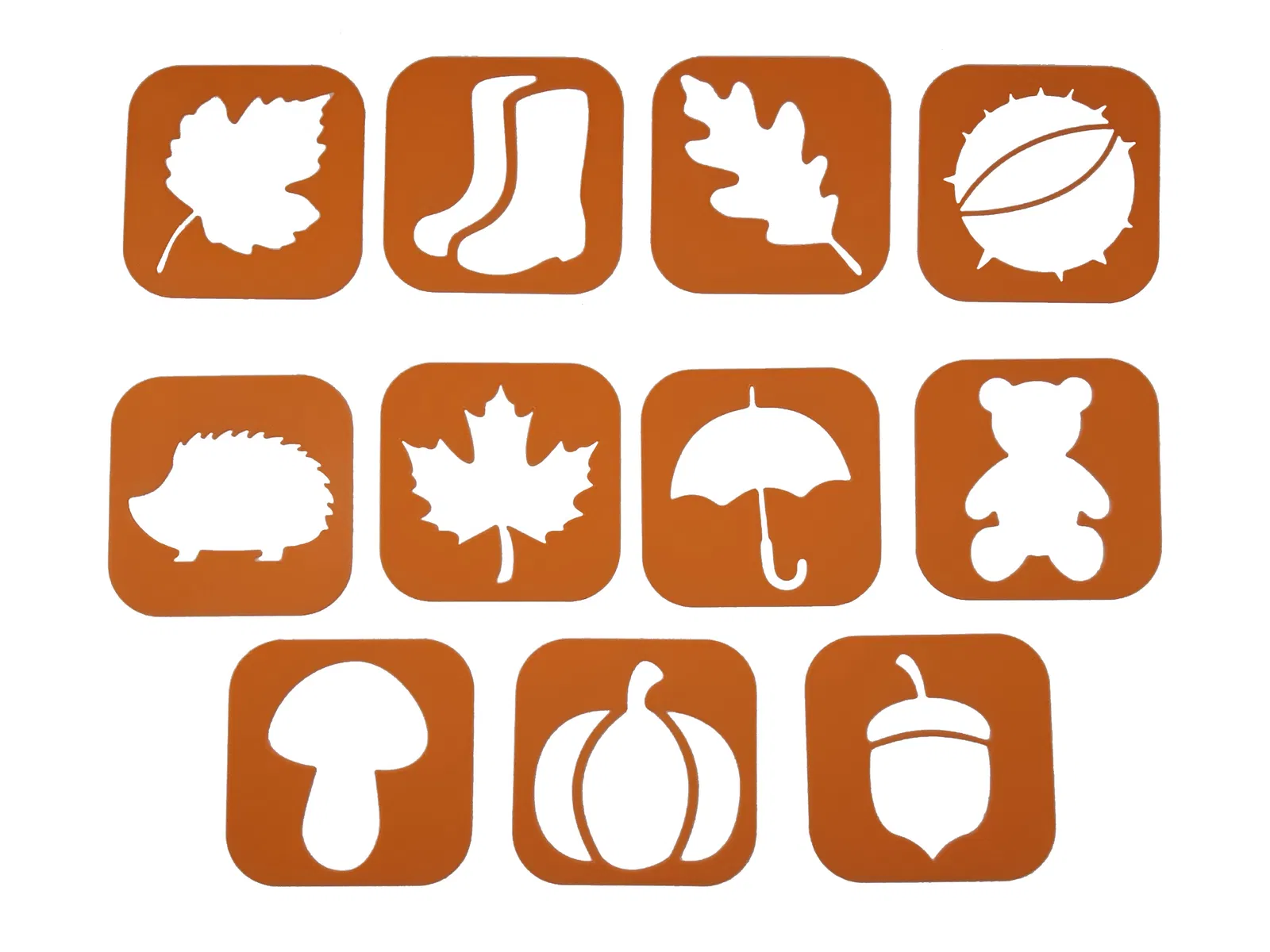 Mỗi khuôn vẽ là một hình vuông bo góc (70x70mm, bán kính góc 15mm, độ dày 1mm) với phần hình cắt rỗng chủ đề mùa thu, giúp bé dễ dàng cầm nắm, tô màu và tập vẽ theo.