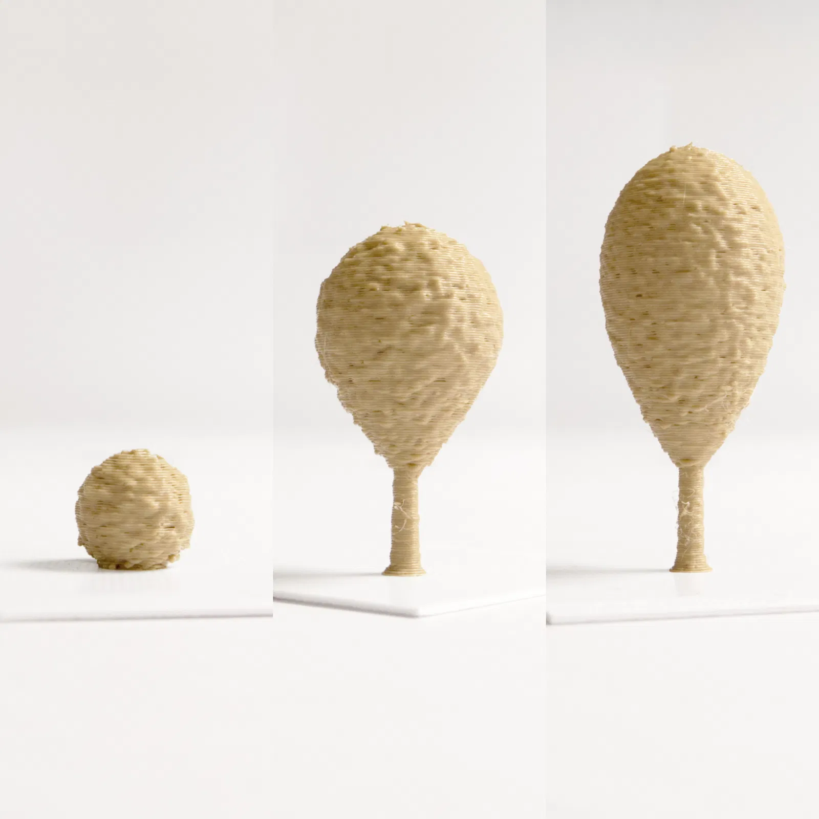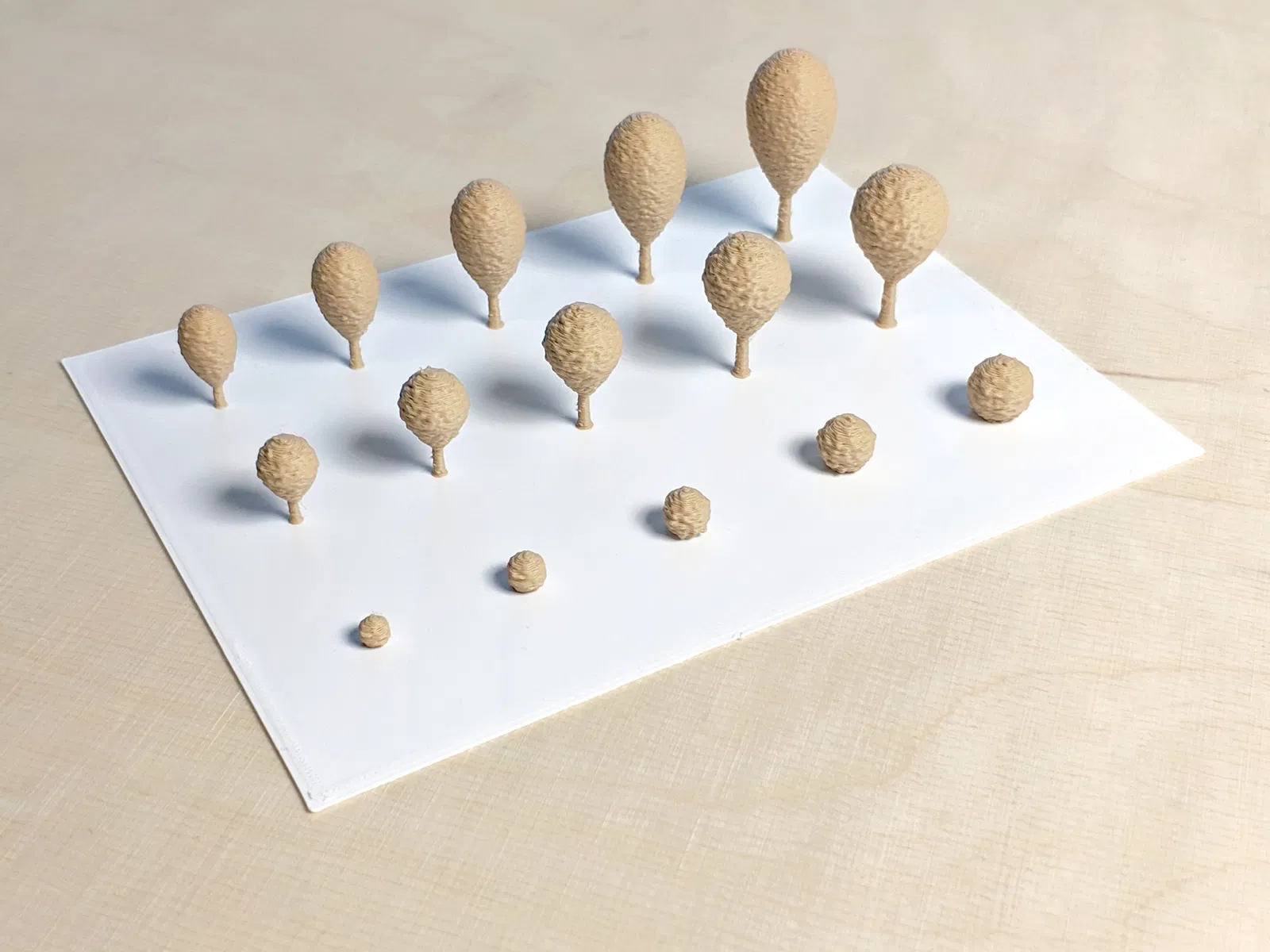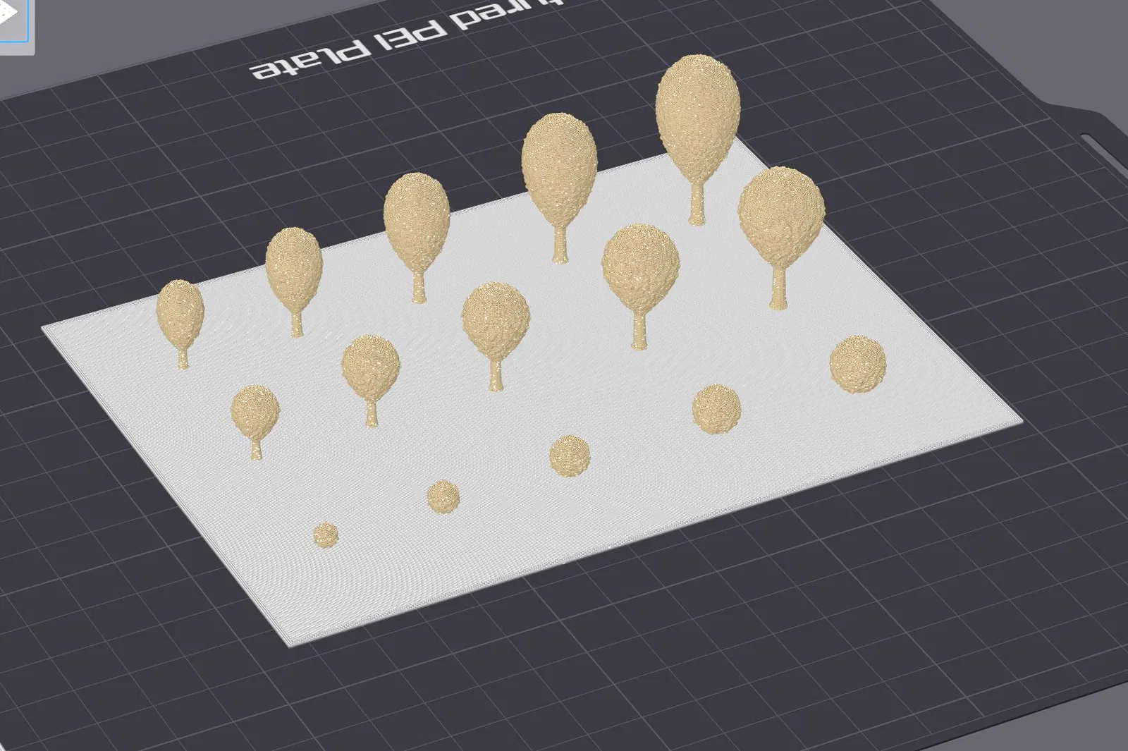 (!) Hãy in với các thông số bên dưới. Chỉ cần một sai số nhỏ cũng có thể làm hỏng bản in vì các mô hình cây cối thường có độ nhô (overhangs). Quan trọng nhất là: in ở tốc độ thấp (nhưng đừng thấp quá), bao gồm cả tốc độ di chuyển đầu in, và giảm thiểu cong vênh ở những phần nhô ra bằng cách tránh gió lạnh thổi vào bản in. Nên giữ nhiệt độ bàn in cao hơn một chút để vật liệu có độ mềm nhất định, giúp thân cây có thể uốn cong mà không bị gãy. Sử dụng 0% infill và không cần support. (!) Không khuyến khích thay đổi tỷ lệ (scale). (!) Chỉ mới kiểm tra trên máy in Core-XY (không khuyến khích dùng máy in dạng bedslinger).