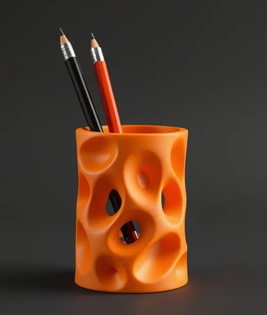 Mẫu ống cắm bút thiết kế trừu tượng đầy nghệ thuật, cao khoảng 10cm. Sản phẩm vừa dùng để trang trí, cắm bút, vừa có thể làm trò chơi rút bút thả bóng thú vị. Thời gian in nhanh, khuyến khích dùng nhựa PLA silk để có vẻ ngoài ấn tượng.
