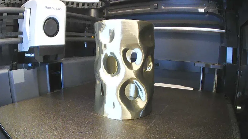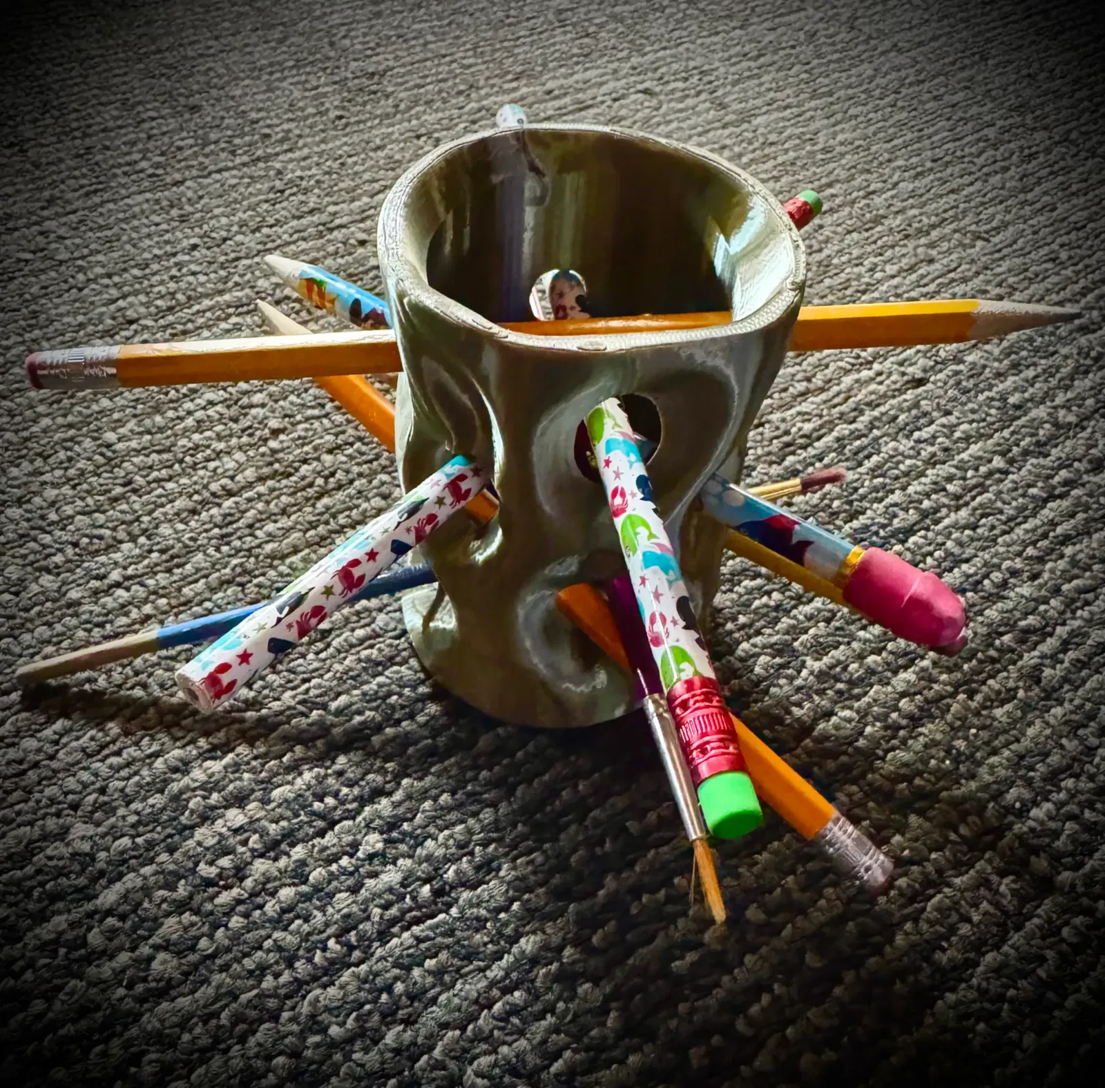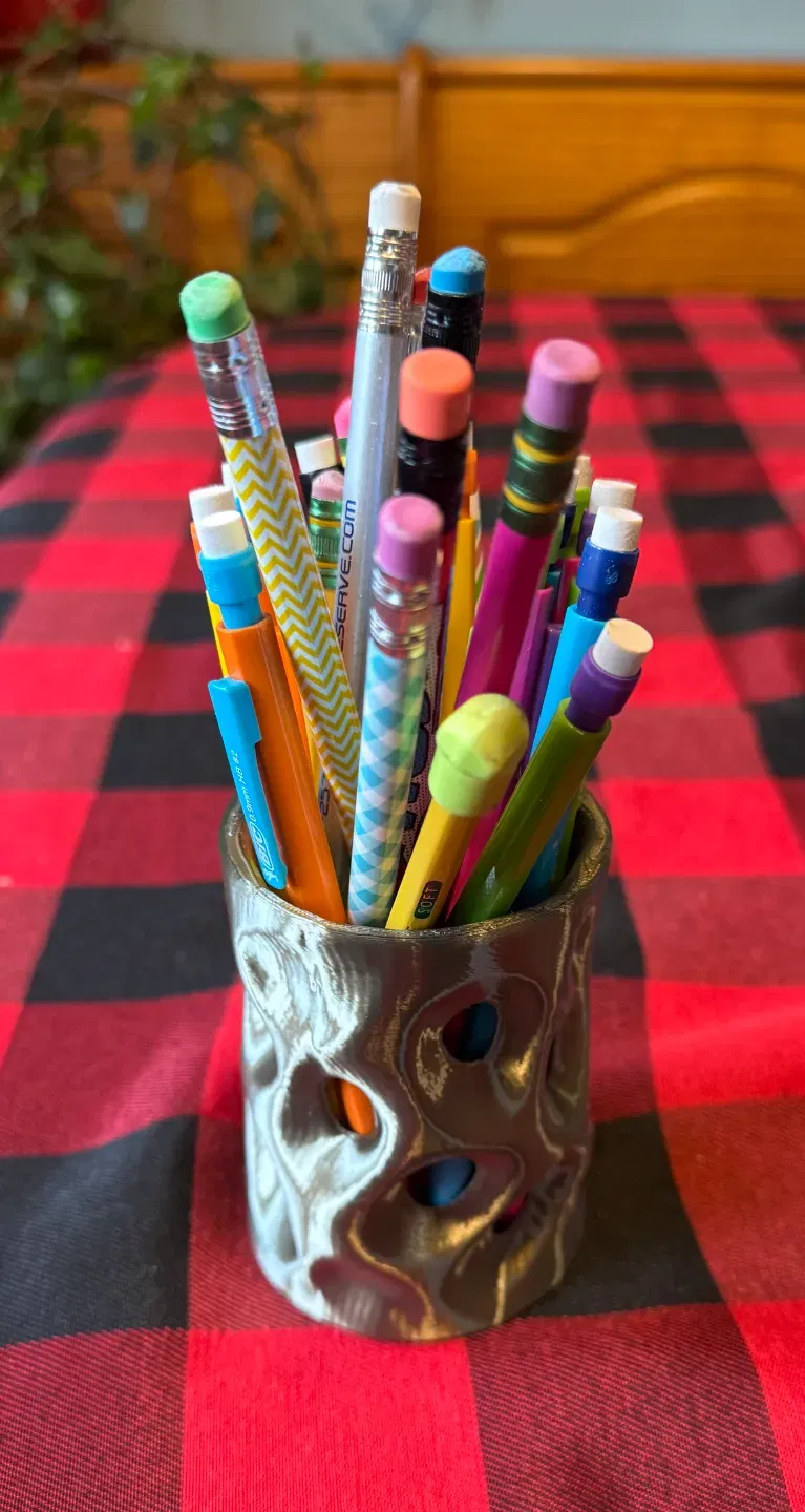 Đây là mẫu ống cắm bút mang phong cách trừu tượng (Abstract) và đầy tính nghệ thuật, có chiều cao khoảng 4 inch (khoảng 10cm). Bạn chỉ mất chưa đầy hai tiếng để in xong mẫu này. Mình khuyên bạn nên dùng mật độ in (infill) thấp thôi vì ở một vài vị trí, thành ống khá dày. Mình đã in bằng nhựa PLA silk, đó là lý do nhìn sản phẩm trong ảnh lại bắt mắt như vậy. Ngoài công dụng cắm bút, mẫu này còn có thể dùng để chơi trò rút bút thả bóng (ball drop challenge). Cách chơi rất đơn giản: từng người lần lượt rút từng chiếc bút ra khỏi lỗ, ai rút được nhiều bút nhất mà không làm quả bóng rơi xuống đáy thì người đó thắng.