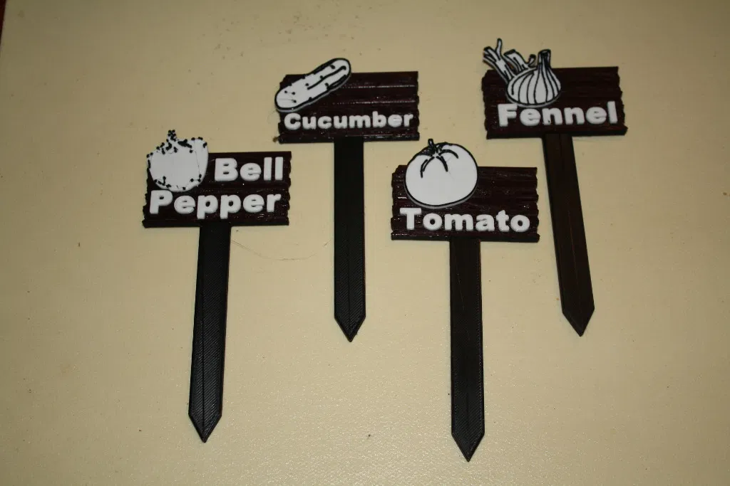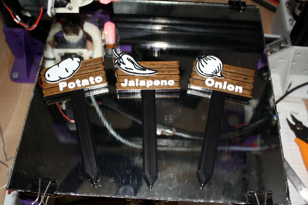 Để đánh dấu xem cây gì đang trồng ở đâu, trước đây mình toàn dùng que kem với bút lông Sharpie để ghi chú các luống vườn. Giờ có máy in 3D rồi, mình muốn làm cái gì đó độc đáo hơn. Mình thiết kế mấy cái bảng tên này nhìn giống như mấy thanh gỗ cũ kỹ bị trầy xước vậy. Mỗi cọc cắm không chỉ có tên cây mà còn kèm theo hình vẽ siêu dễ thương của loại cây đó khi trưởng thành nữa. Sau vài năm làm vườn không mấy suôn sẻ, đây là những loại cây mình quyết định trồng năm nay, nhưng mình sẽ làm thêm các bảng tên khác khi có thời gian. Nếu mọi người muốn tự thiết kế riêng, mình đã đính kèm file cọc cắm trống để các bạn sử dụng cho sáng tạo của mình nhé.