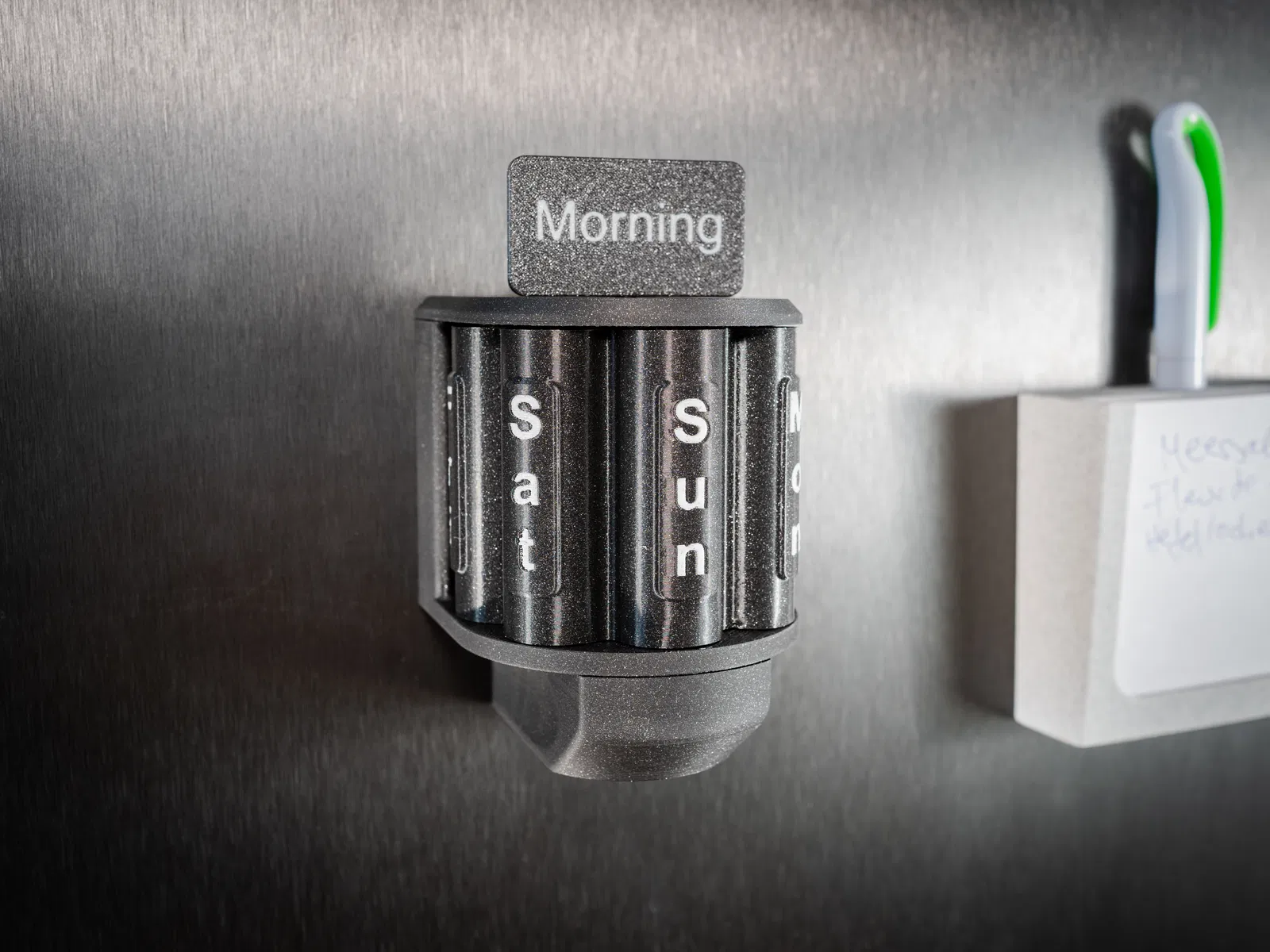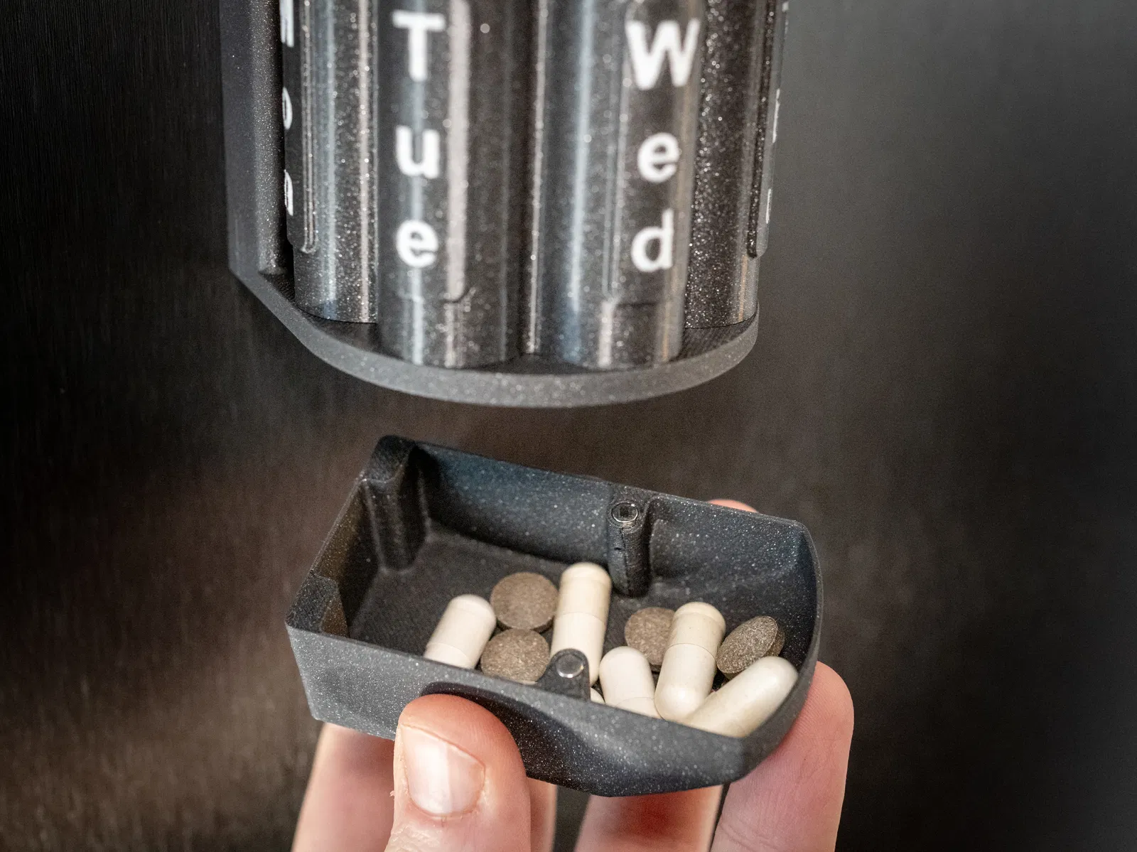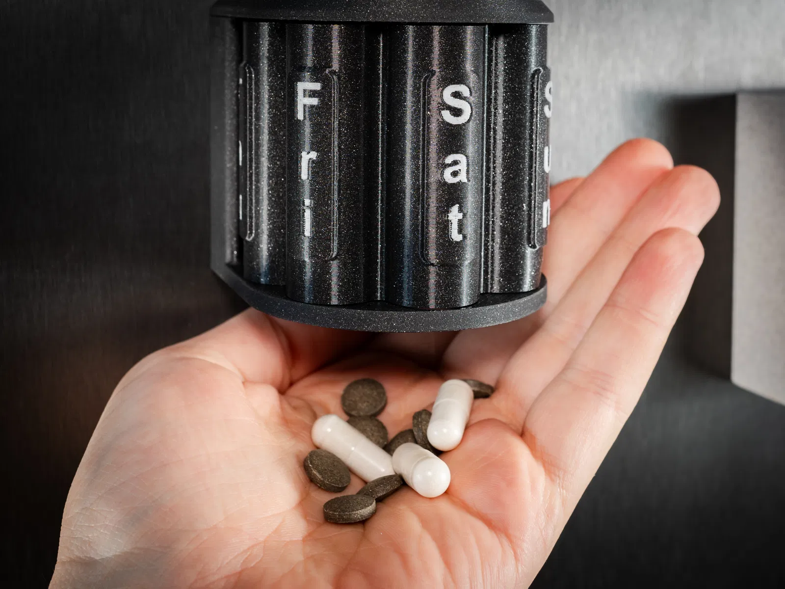 Được làm từ nhựa in 3D bền và nhẹ, hộp có bảy ngăn, mỗi ngăn tương ứng với một ngày từ Thứ Hai đến Chủ Nhật. Bạn chỉ cần xoay ổ đạn đến đúng ngày cần dùng, việc lấy đúng liều thuốc trở nên vô cùng đơn giản.