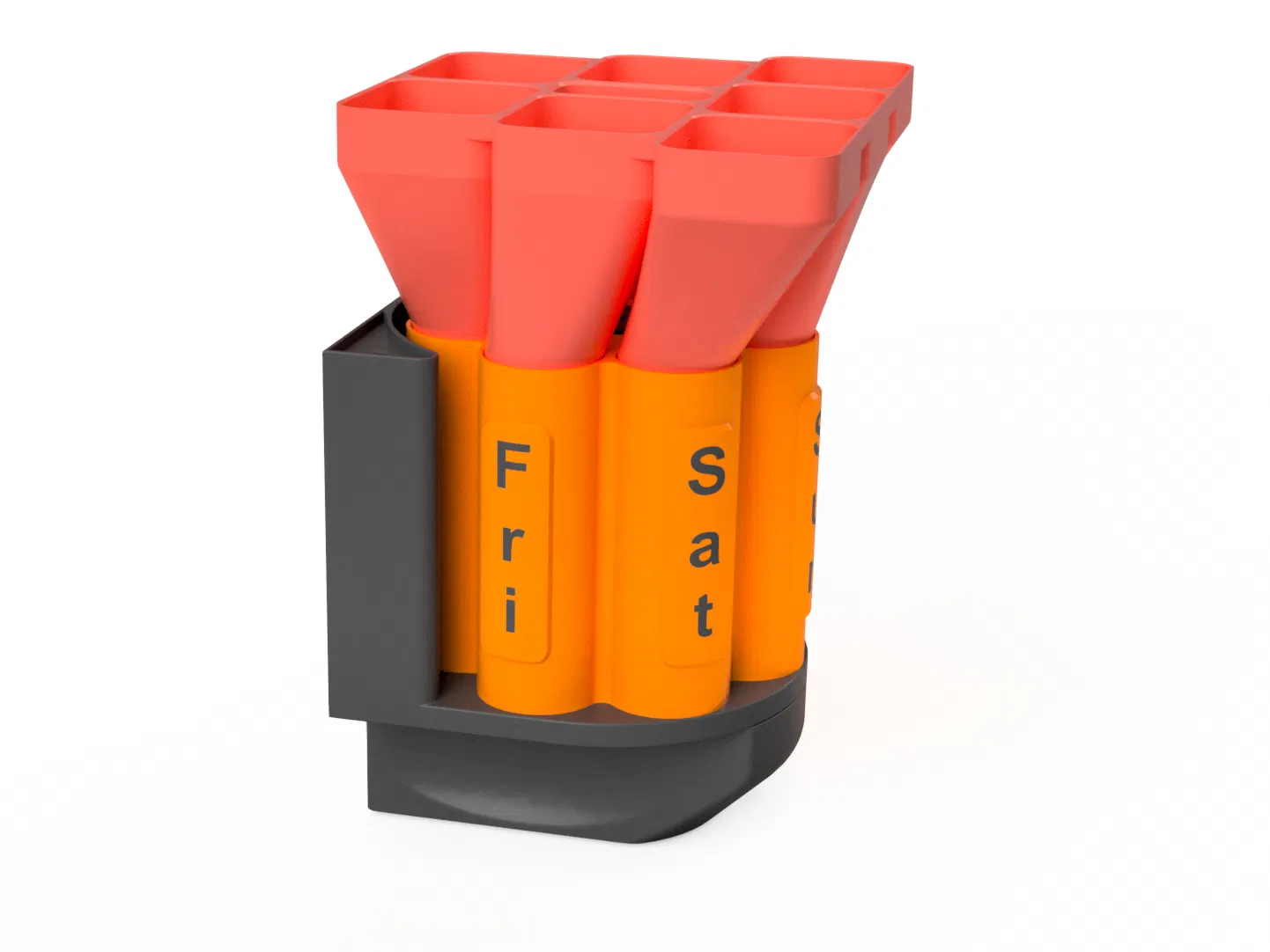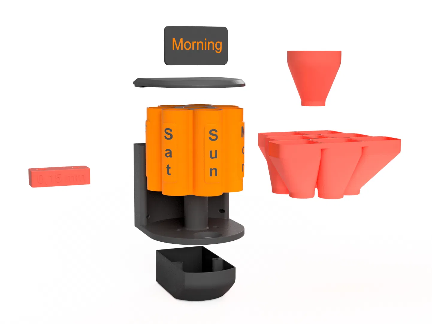 Ngoài ra, để việc nạp thuốc dễ dàng hơn, mình đã đính kèm hai thiết kế phễu. Những chiếc phễu này giúp việc đổ thuốc vào từng ngăn trở nên nhanh chóng và sạch sẽ.