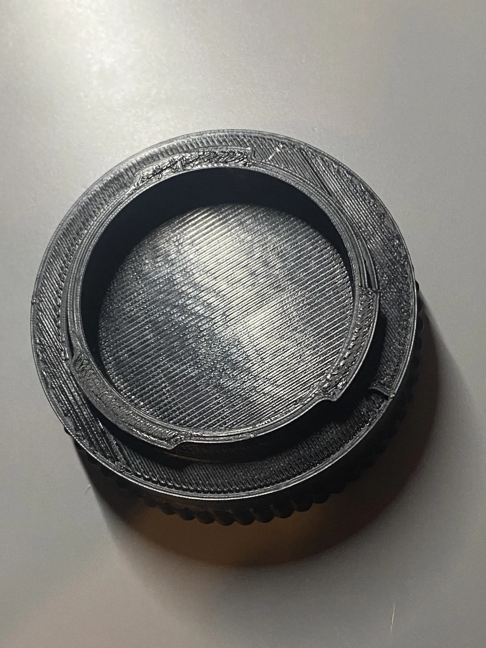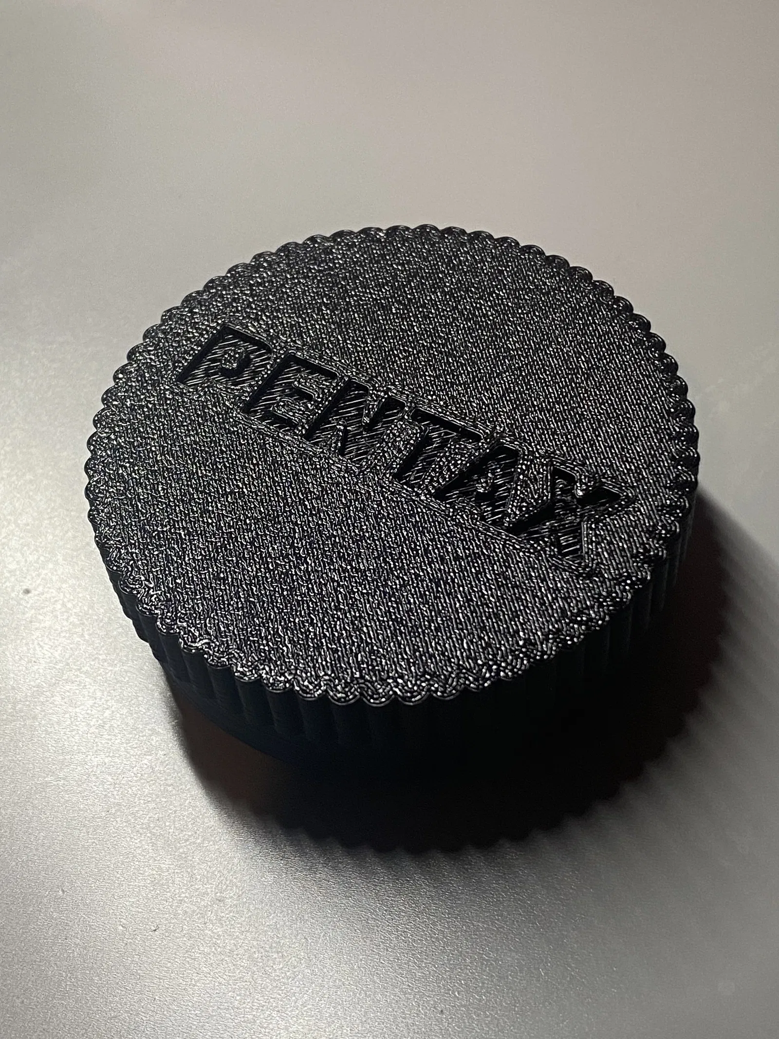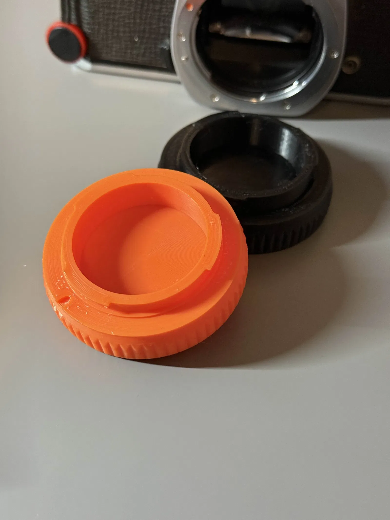 Mình đã thiết kế 4 phiên bản nắp đậy thân máy (body cap) để các bạn tùy chọn theo nhu cầu. Có 2 loại: loại giữ nguyên chốt khóa và loại bỏ chốt khóa, đồng thời mỗi loại lại có thêm lựa chọn có hoặc không có logo Pentax. Mình đã in mẫu có logo và chốt khóa bằng chiếc Ender 3 v2 đã độ nhẹ, dùng đầu in 0.4mm với layer height 0.2mm và thấy lắp vừa khít trên chiếc Pentax K1000 của mình. (Sau một thời gian sử dụng, mình thấy nắp hơi lỏng lẻo một chút nên có thể mình sẽ cập nhật lại file để tăng độ khít cho đường kính ngoài của cơ chế khóa).