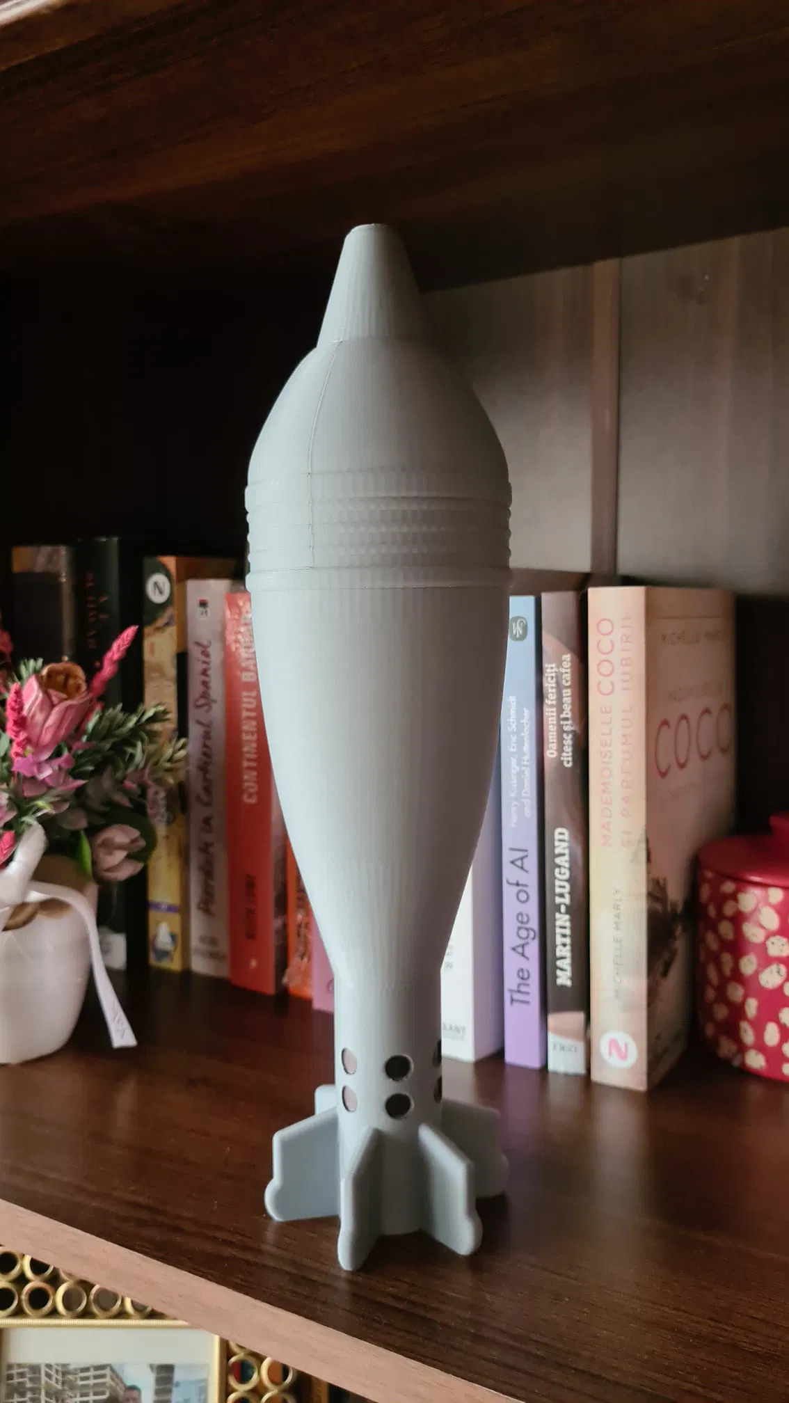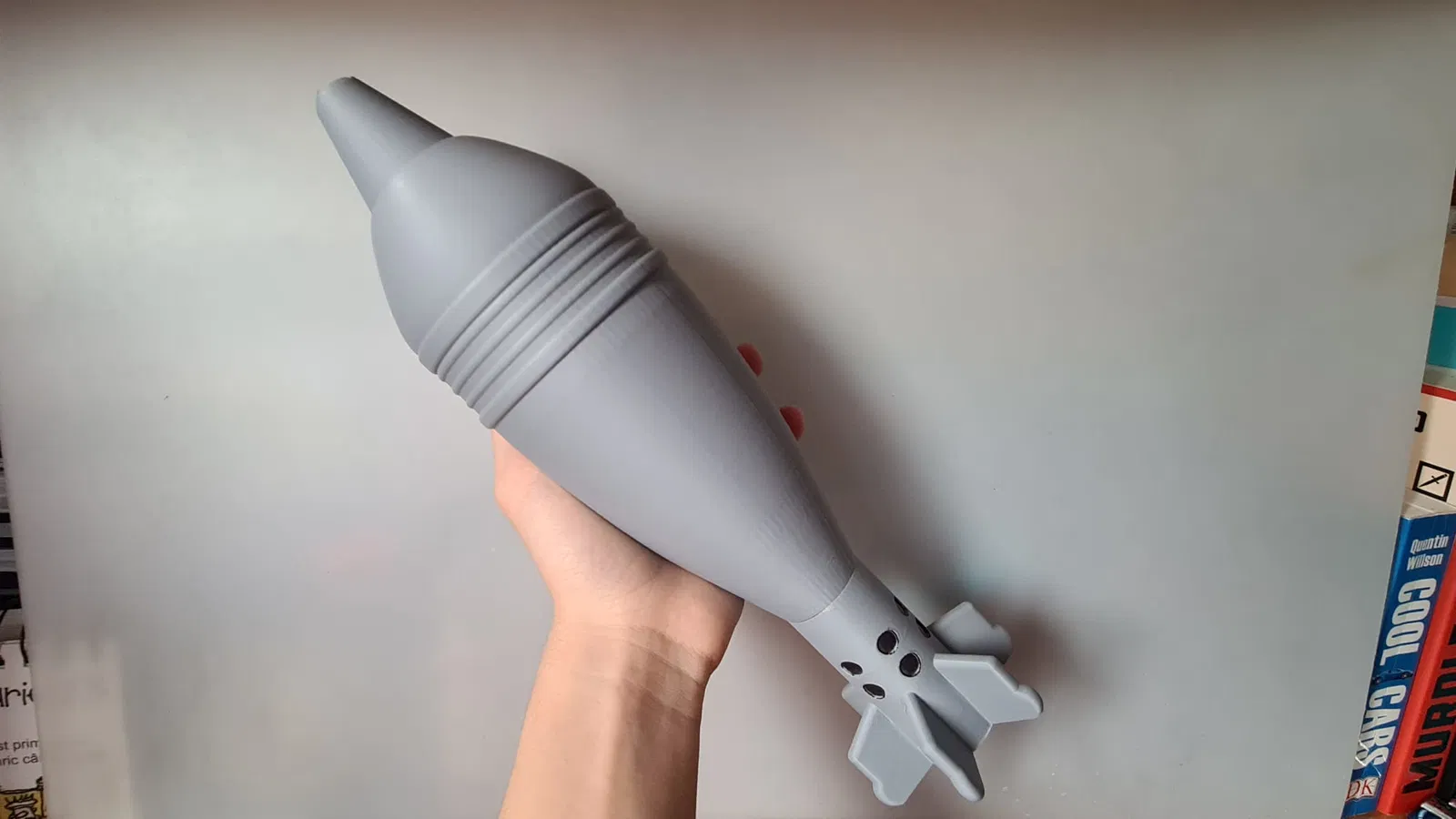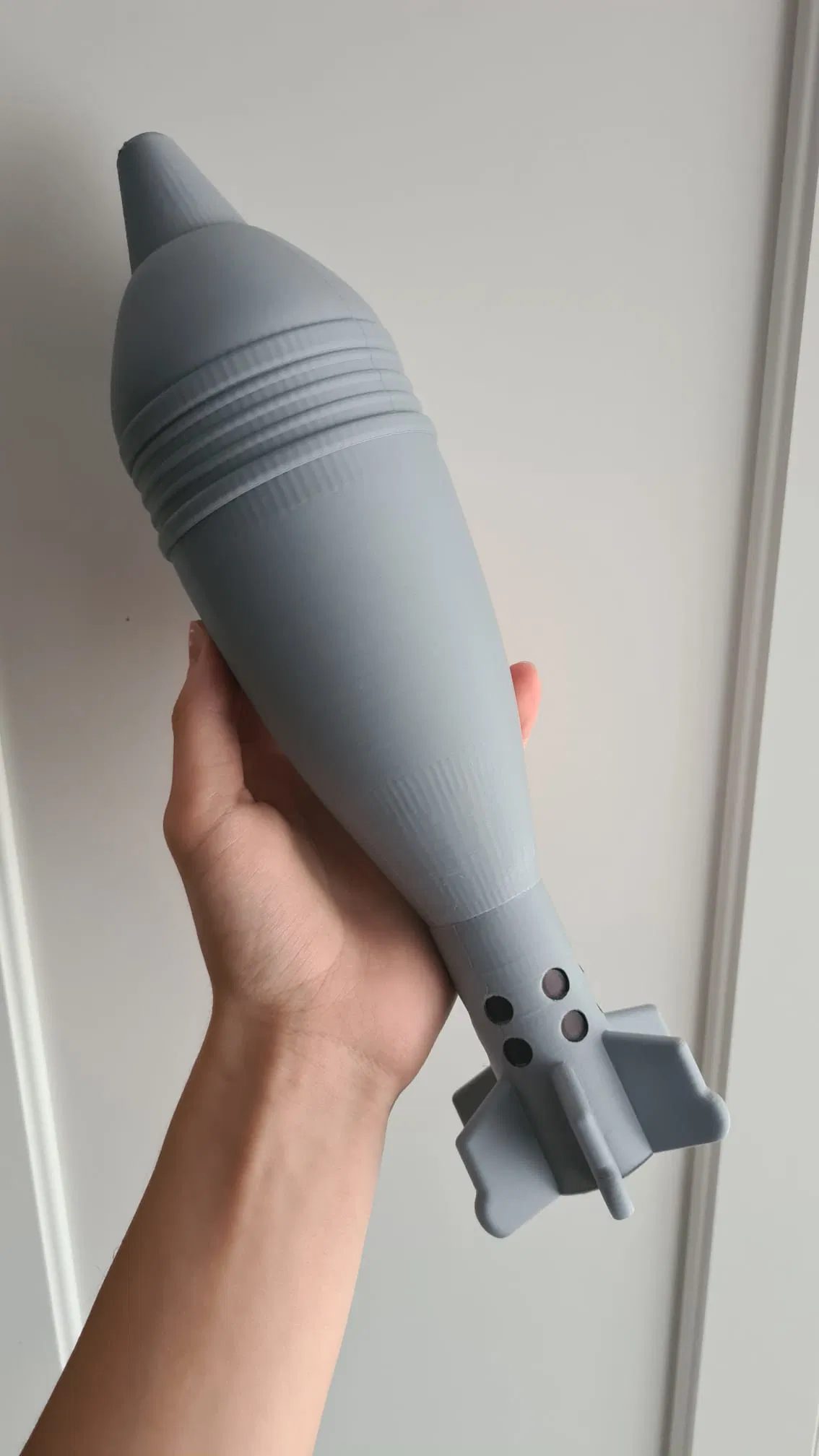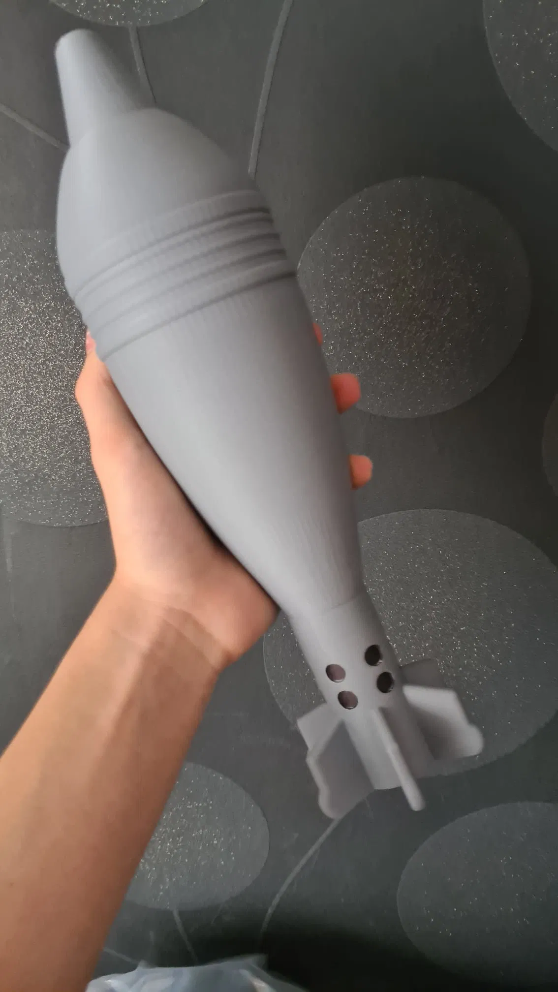 Mô tả: Đây là bản sao của quả đạn cối 82mm kiểu Liên Xô. Mô hình có thiết kế ngòi nổ và cánh đuôi có thể vặn ren như hàng thật. Mình làm rỗng phần thân để các bạn có thể đổ cát hoặc bi sắt vào bên trong nhằm tạo trọng lượng thực tế (nặng khoảng 3,5 kg).