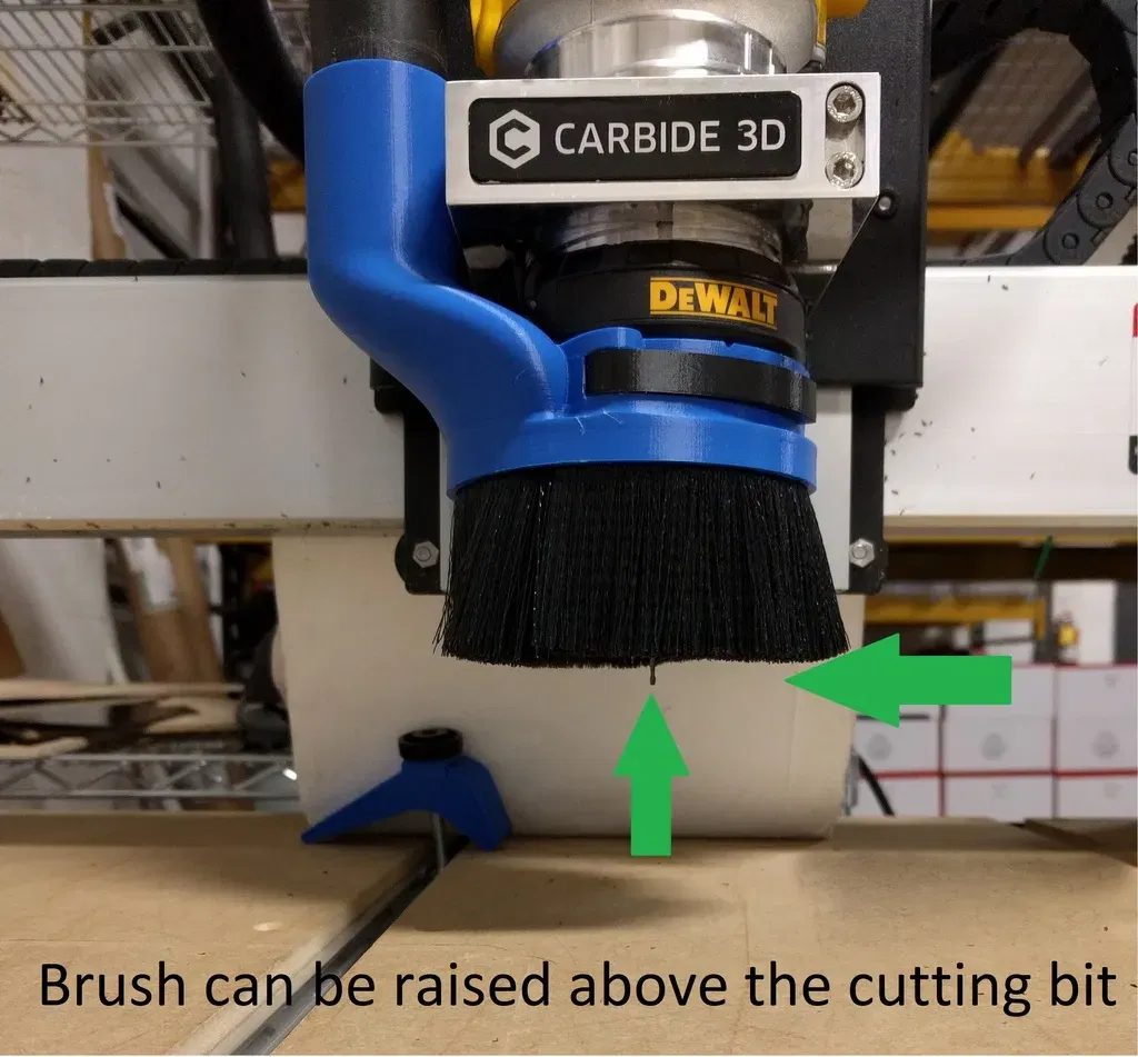 Giày hút bụi này sử dụng vòng điều chỉnh màu đen đi kèm từ router DeWalt 611 để kiểm soát chiều cao của chổi và hoạt động như một cơ chế thả nhanh để thay đổi công cụ dễ dàng. (Vòng này thường được sử dụng để kiểm soát độ sâu của mũi khoan khi sử dụng như một router cầm tay.)