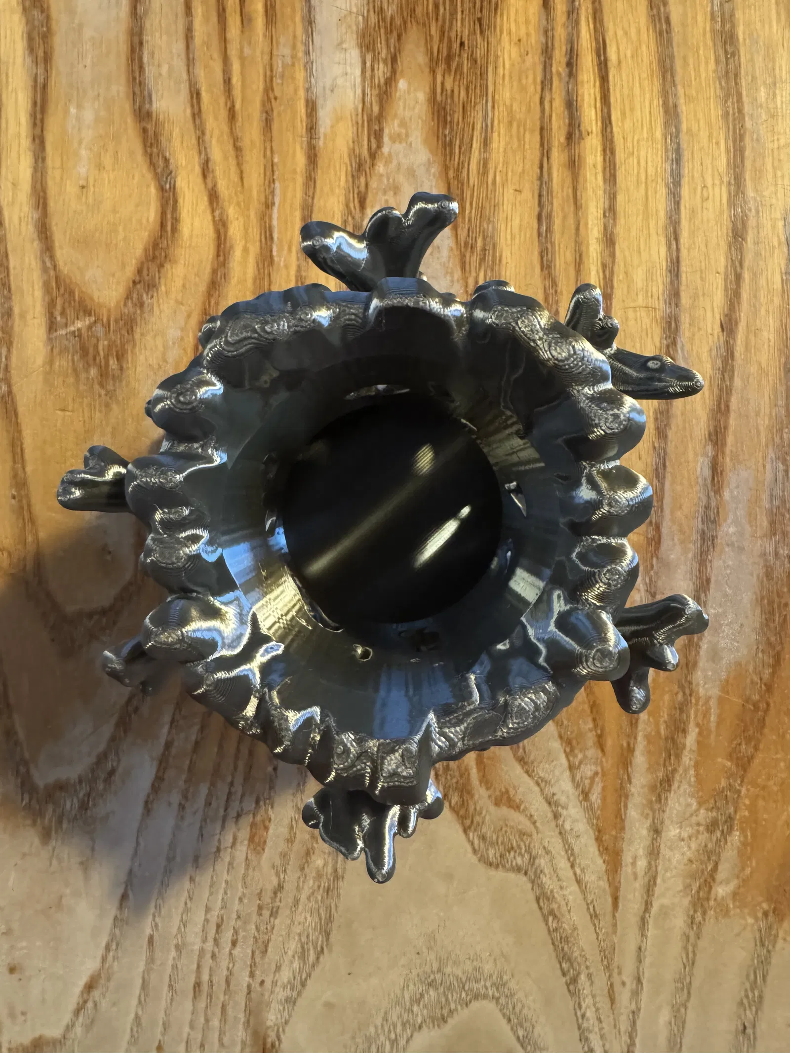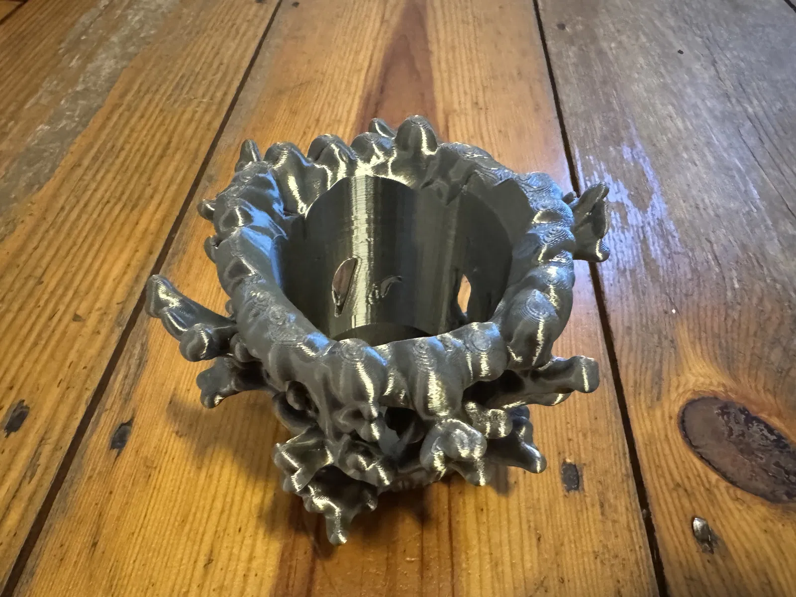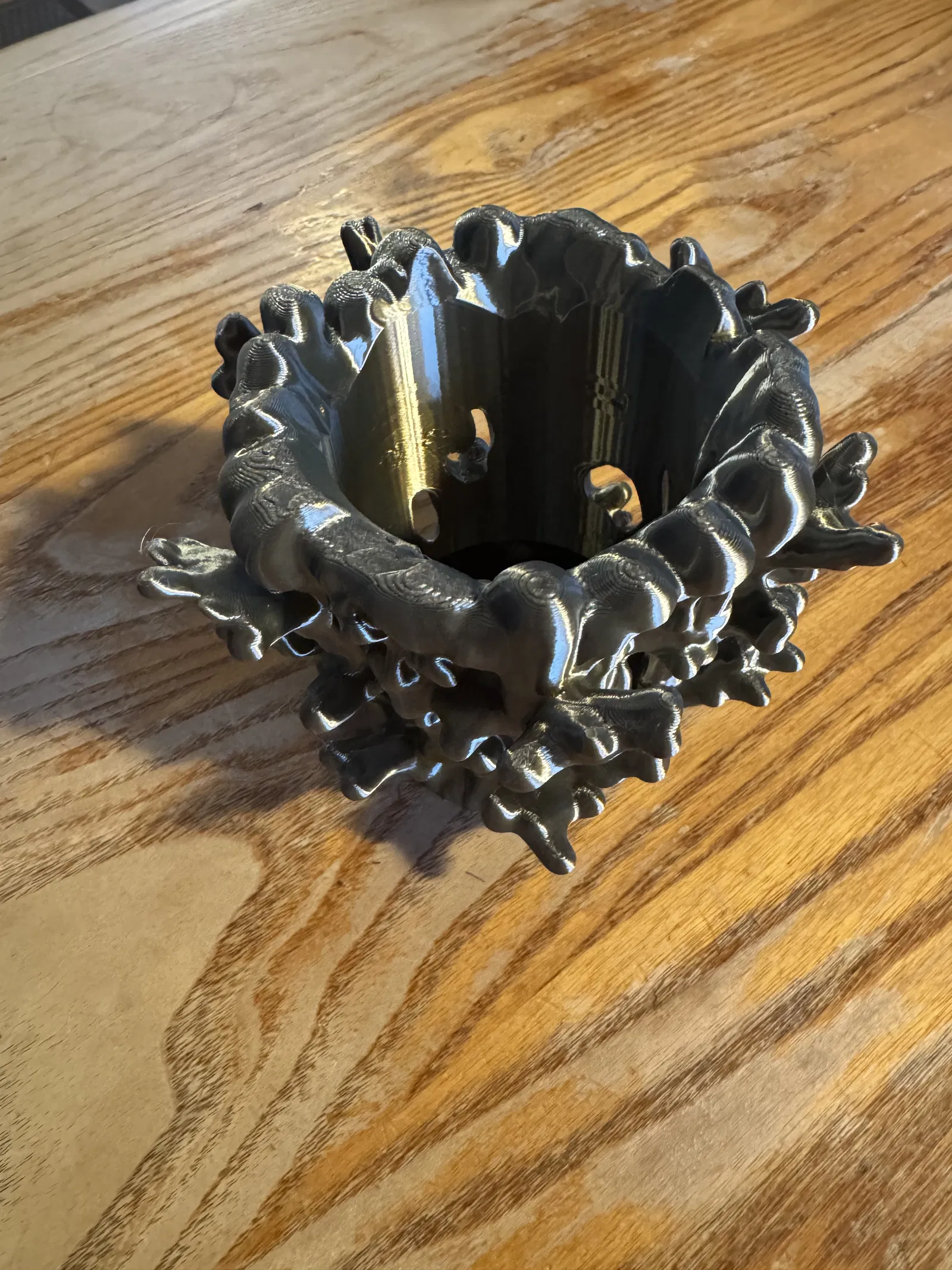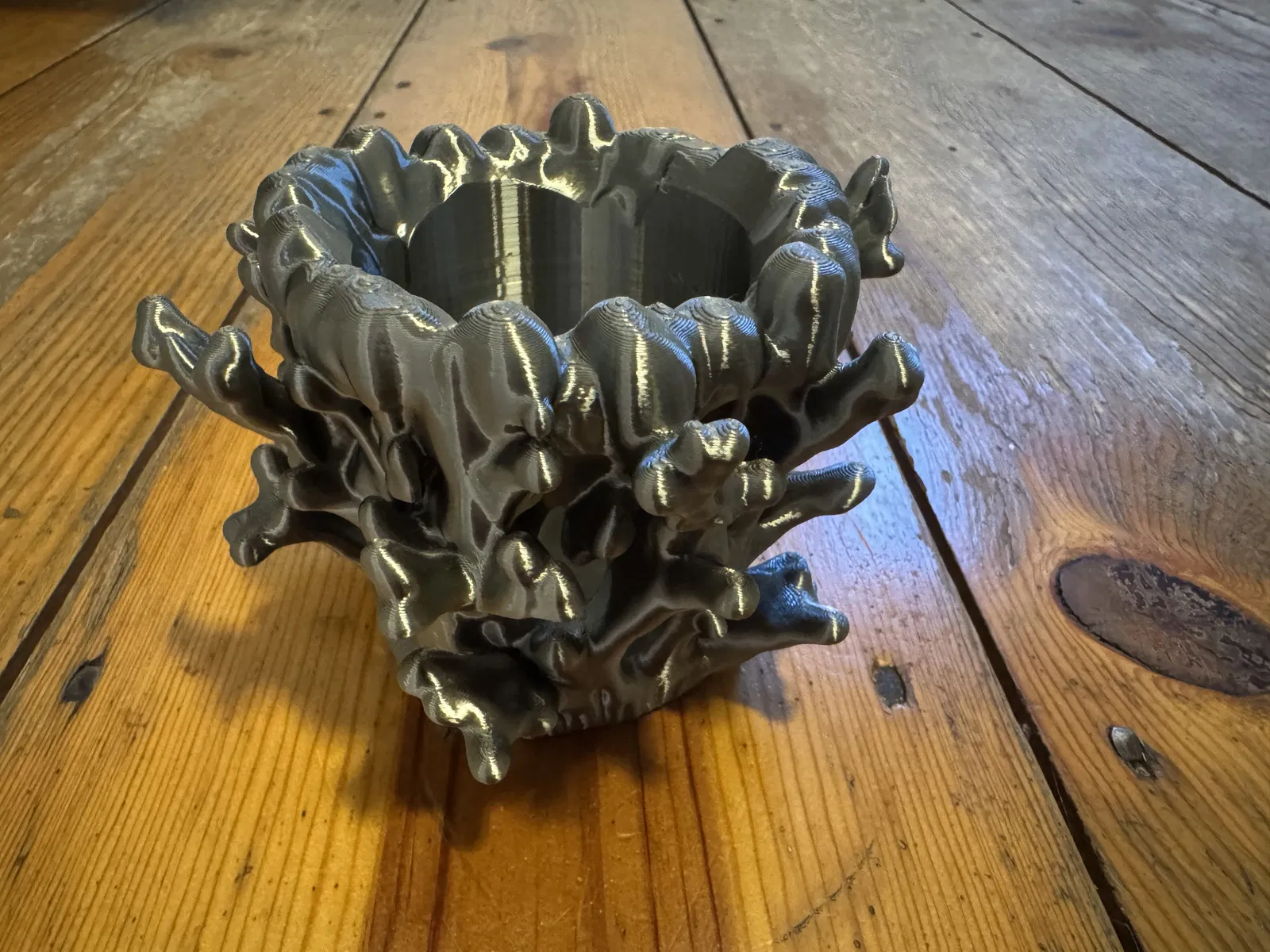 Mẫu thiết kế này là một ống cắm bút hình san hô cao khoảng 3.5 inch. Bạn sẽ mất tầm 5 tiếng để in xong. Mình khuyên là nên để mật độ in (infill) thấp thôi (hoặc cứ dùng file 3mf của mình) vì ở một số chỗ vách nó khá dày. Mình in bằng nhựa PLA silk nên nhìn nó mới có hiệu ứng đẹp như trong hình đó.