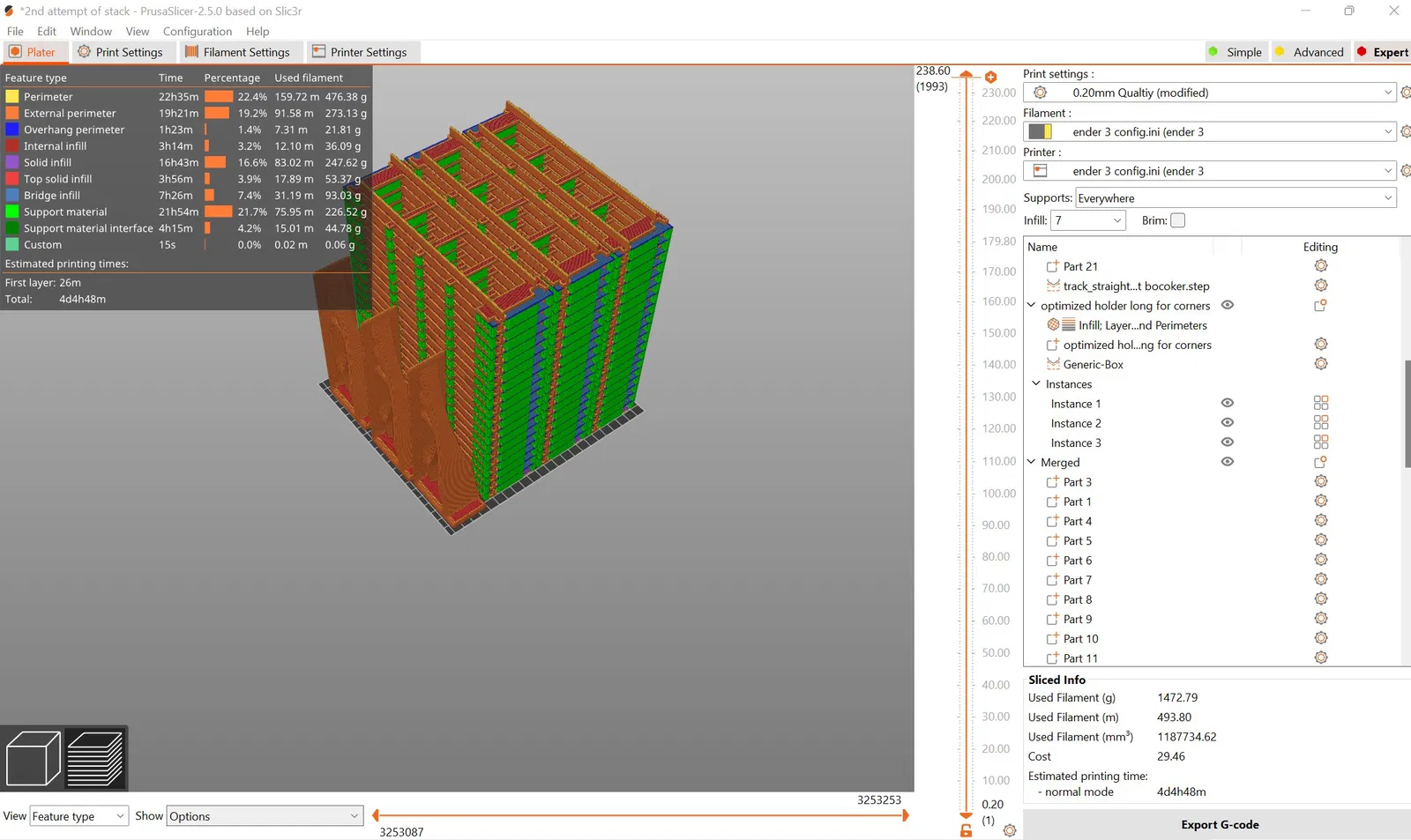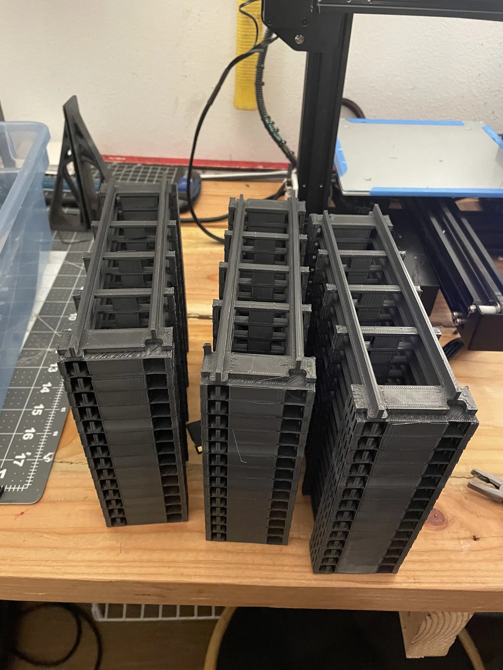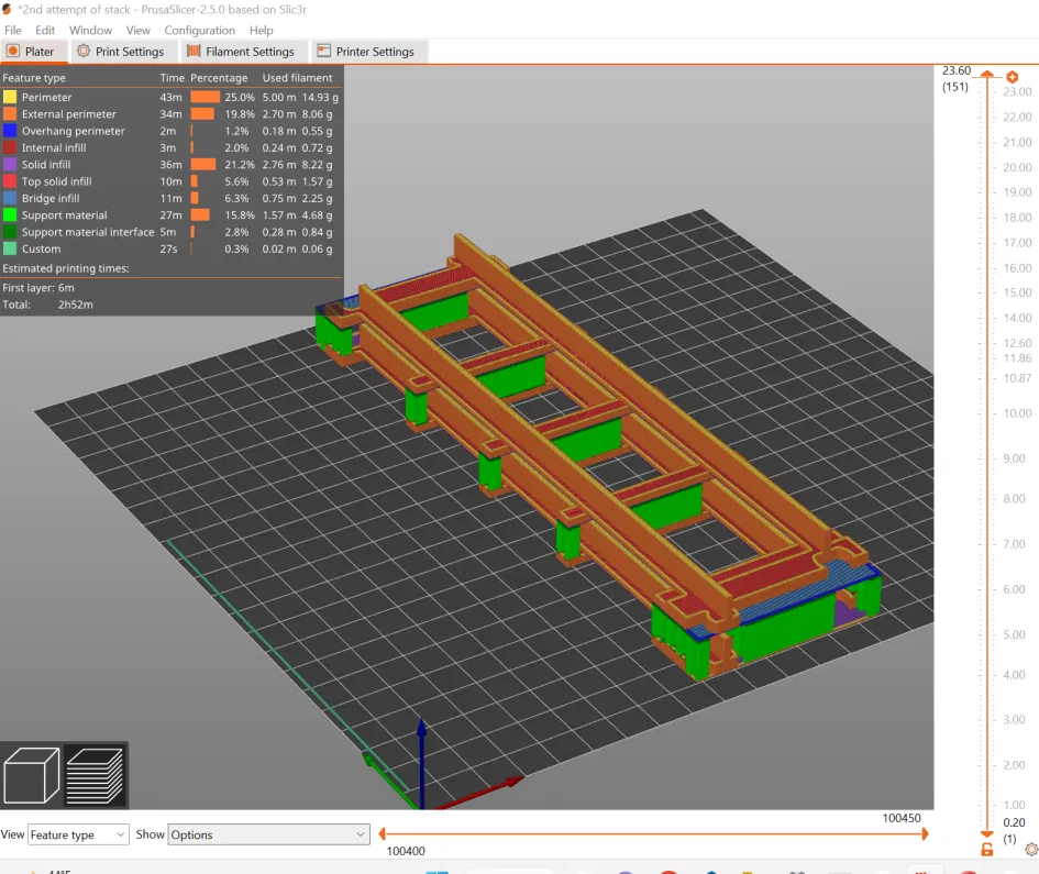 Việc in chồng (stacking) là một sự đánh đổi, bạn không phải mất công cắm in mỗi 4 tiếng nhưng sẽ tốn khoảng 5g nhựa cho phần support mỗi thanh ray và mất 1-2 phút để gỡ support. Dùng dao rọc giấy, kìm và dụng cụ mài ba via để đạt kết quả tốt nhất.