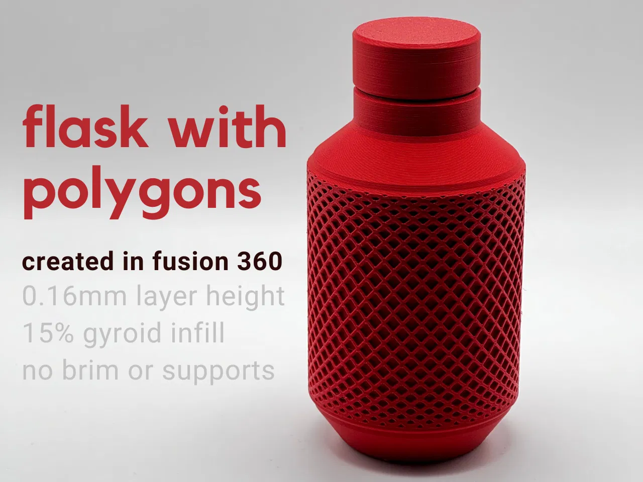 Việc in ở mức 0.16mm thay vì 0.20mm sẽ làm tăng thời gian in thêm khoảng 30 phút, nhưng theo mình thì rất đáng giá vì nó giúp họa tiết chi tiết hơn và chất lượng ren vặn nắp được cải thiện rõ rệt.