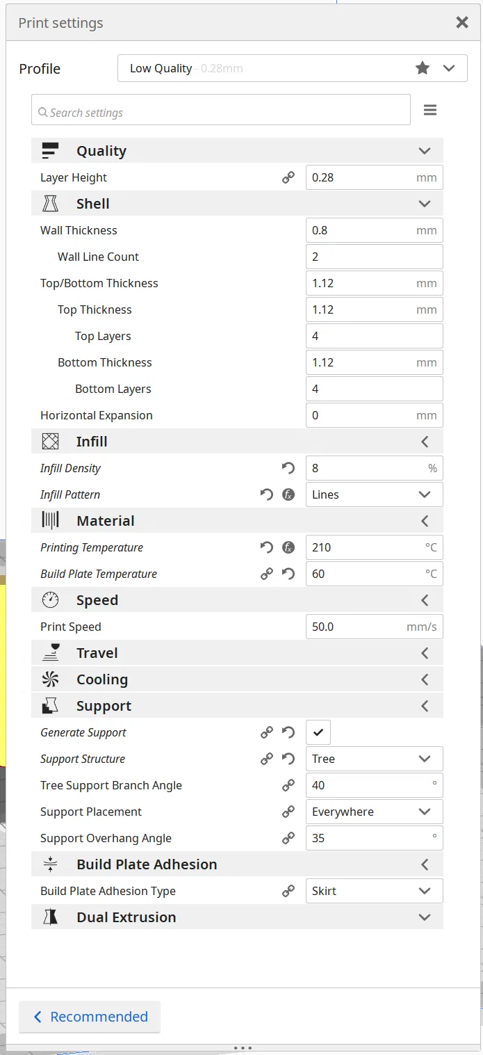 - Cài đặt in 3D: Theo khuyến nghị từ thiết lập mẫu, bạn nên sử dụng tùy chọn 'Generate Support' với cấu trúc 'Tree Support' để đảm bảo các chi tiết cong được in đẹp và chính xác nhất.