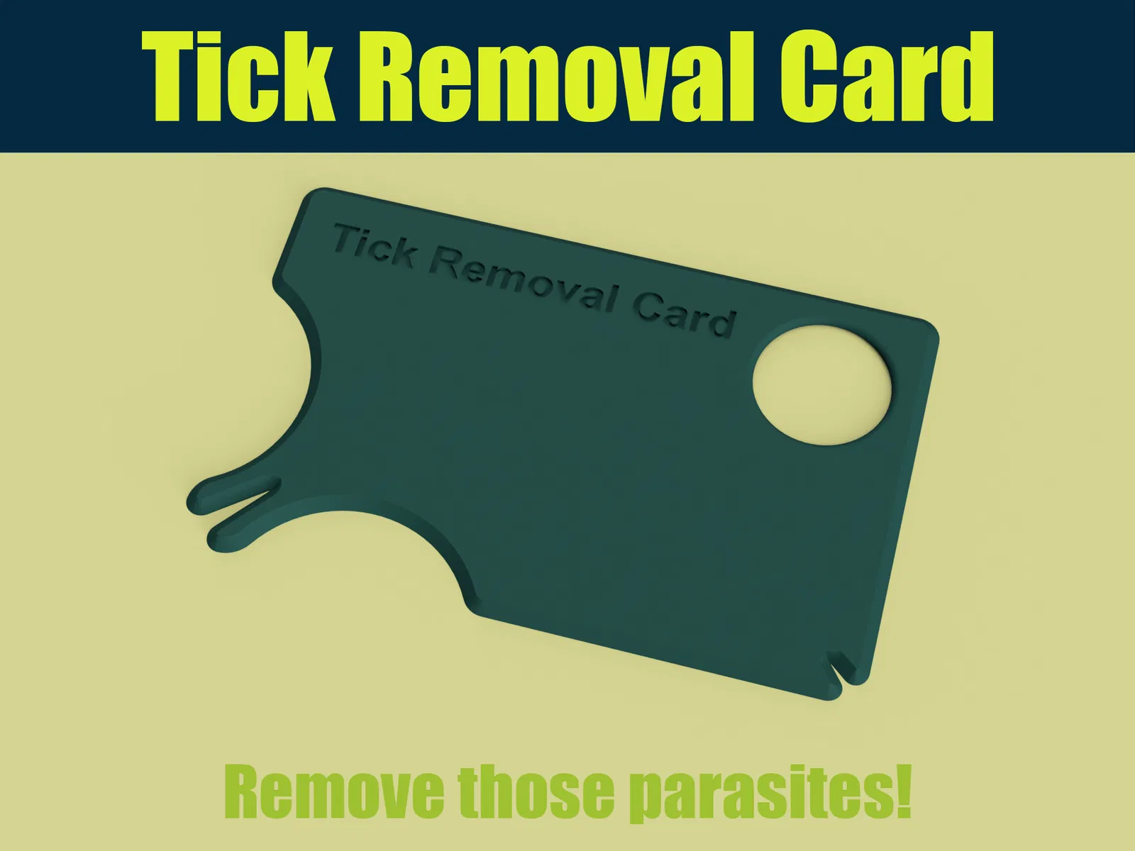 Chiếc thẻ kích thước nhỏ gọn như thẻ tín dụng này là công cụ hỗ trợ bạn lấy ve chó bám trên da hiệu quả. Sản phẩm có độ dày 1.5mm, dễ dàng bỏ túi và in nhanh chóng bằng máy in 3D với nhựa PLA hoặc PETG. Một vật dụng cần thiết cho tủ thuốc gia đình.