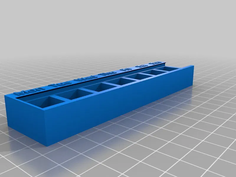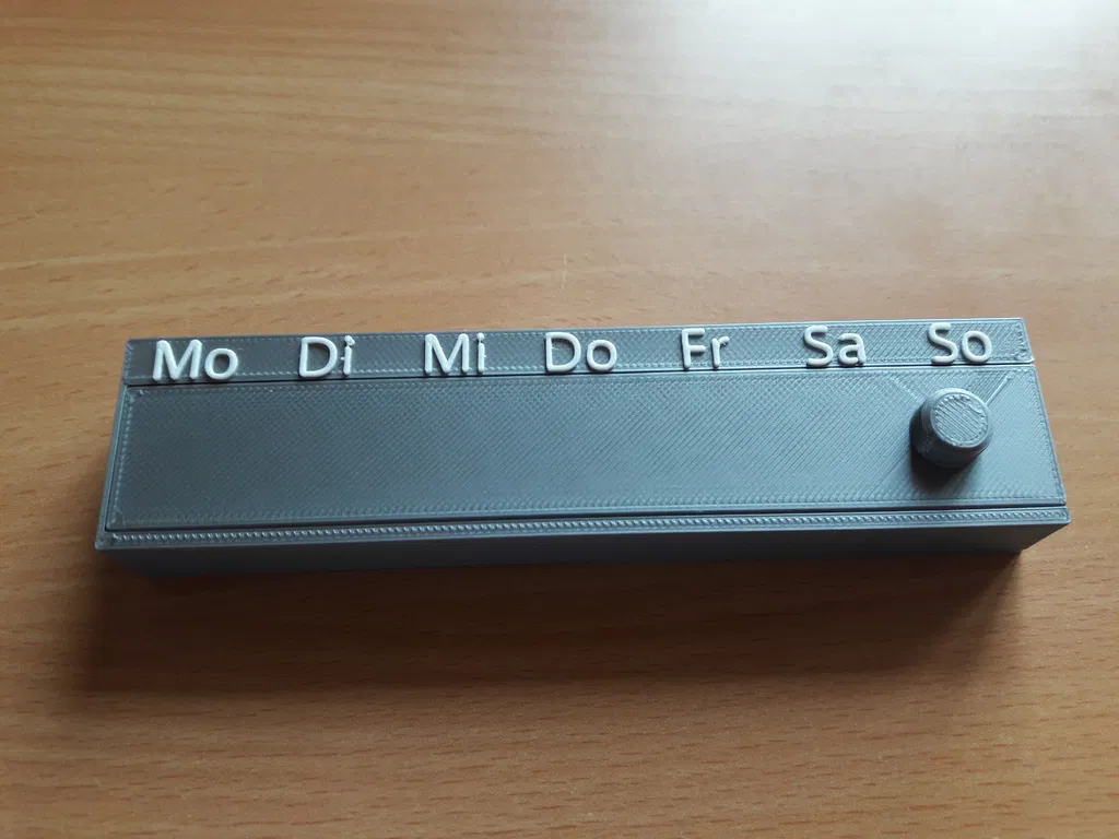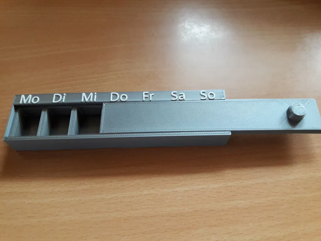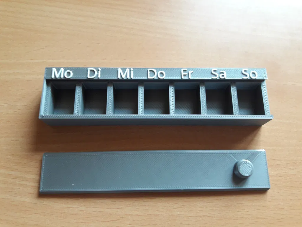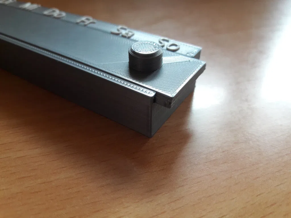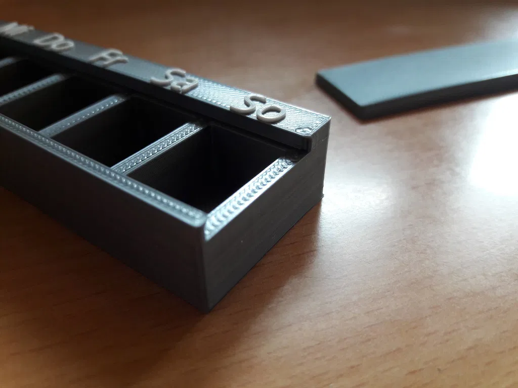 Sản phẩm hiện đã có sẵn phiên bản với các ký hiệu viết tắt bằng tiếng Anh cho các ngày trong tuần! Hộp được thiết kế thêm một cái chốt nhỏ giúp nắp không tự bung ra ngoài. Khi đóng lại, bạn còn nghe thấy tiếng "tách" rất vui tai. Do độ dung sai không quá lớn, nên nếu lớp in đầu tiên bị bè ra một chút, bạn cần gọt tỉa nhẹ xung quanh phần nắp để đậy vừa khít. Tôi sử dụng tính năng đổi màu cho phần chữ thông qua trang web của Prusa để chỉnh sửa G-code. Bạn có thể tự chọn lớp thay nhựa (nếu in ở tỷ lệ 100% thì lớp thay là 15.2). Trang web hỗ trợ đổi màu nhựa của Prusa: https://www.prusaprinters.org/color-print/### Cài đặt in ấnThương hiệu máy in: PrusaMáy in: i3 MK2SBè (Rafts): Không cần thiếtHỗ trợ (Supports): KhôngĐộ phân giải: 0.2 mmĐộ lấp đầy (Infill): 20%Danh mục: Vật dụng gia đình
