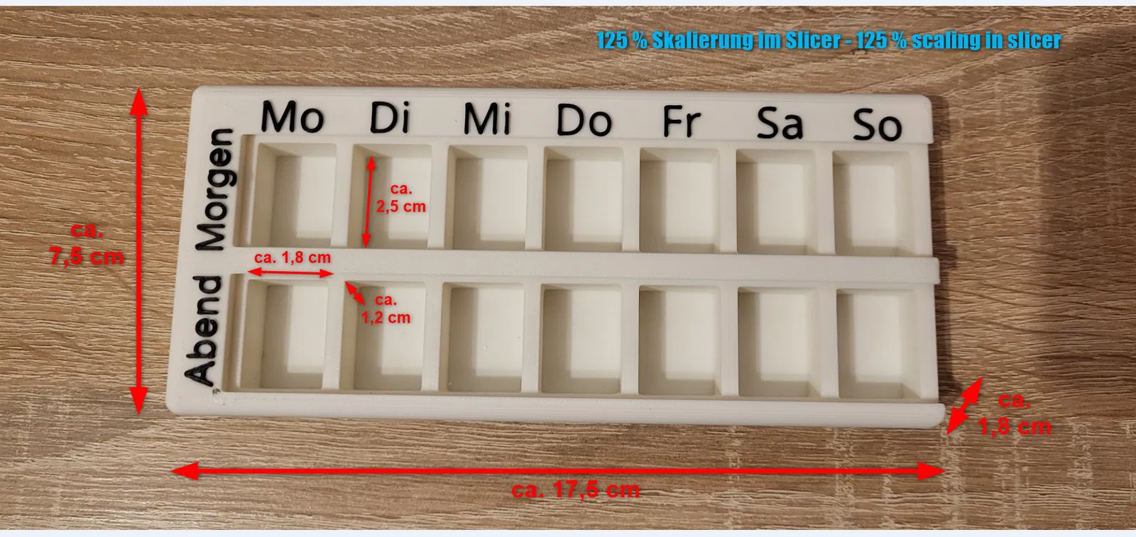 Nay mình đã thiết kế thêm một hàng thứ hai, giúp các bạn có thể chia sẵn thuốc cho cả buổi sáng và buổi tối. Hình ảnh đính kèm là bản remix của mình, được scale lên 125% trong phần mềm slicer. Với kích thước này, mỗi ngăn đựng thuốc có diện tích khoảng 1,2 x 1,8 x 2,5 cm, đủ chứa nhiều viên thuốc nhỏ hoặc một số lượng vừa phải các viên thuốc lớn. Ngoài ra, ở tỉ lệ 125%, hộp cũng dễ cầm nắm hơn cho người lớn tuổi và các chữ in nổi cũng rất dễ đọc. Nếu các bạn có nhu cầu, mình sẵn sàng chia sẻ thêm phiên bản có nhãn bằng tiếng Anh.